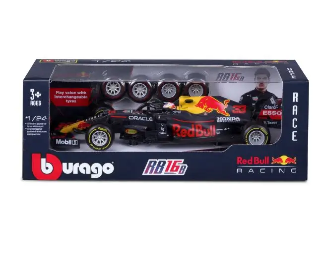 Mycket detaljerad modell av 1:24 av RB18-bilen som kördes av Max Verstappen 2021 med utbytbara däck.