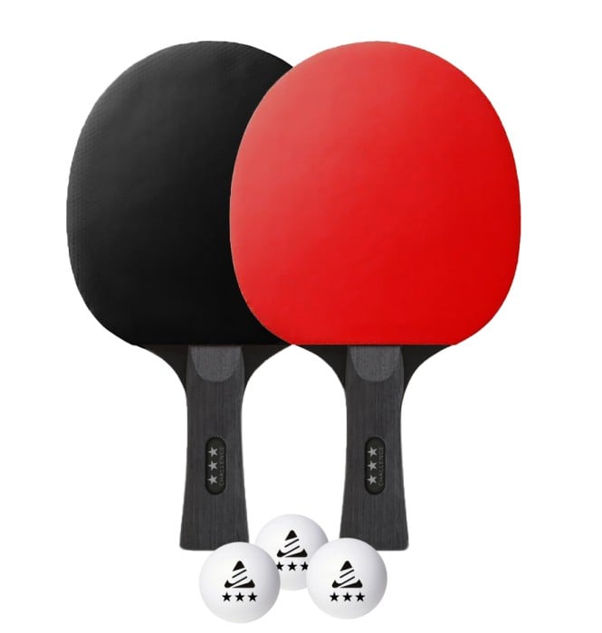 Handtagen på racketerna har en konkav form för optimal kontroll. Bollarna är tillverkade av godkänd ABS-plast enligt ITTF-standard.