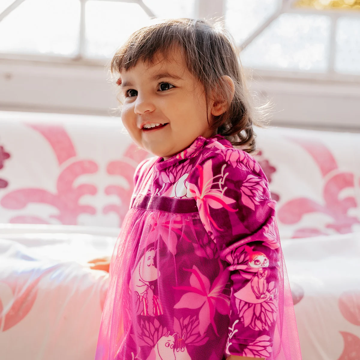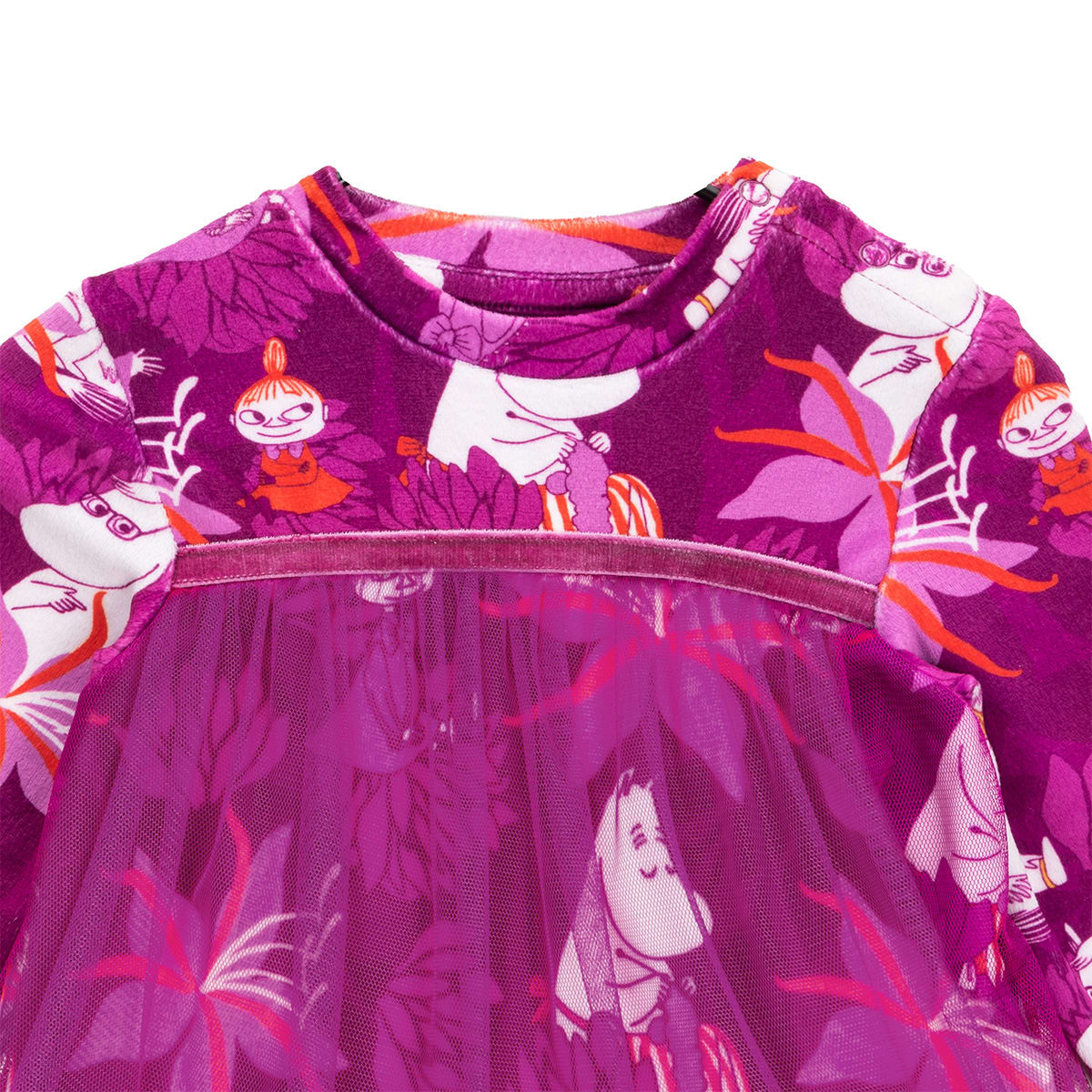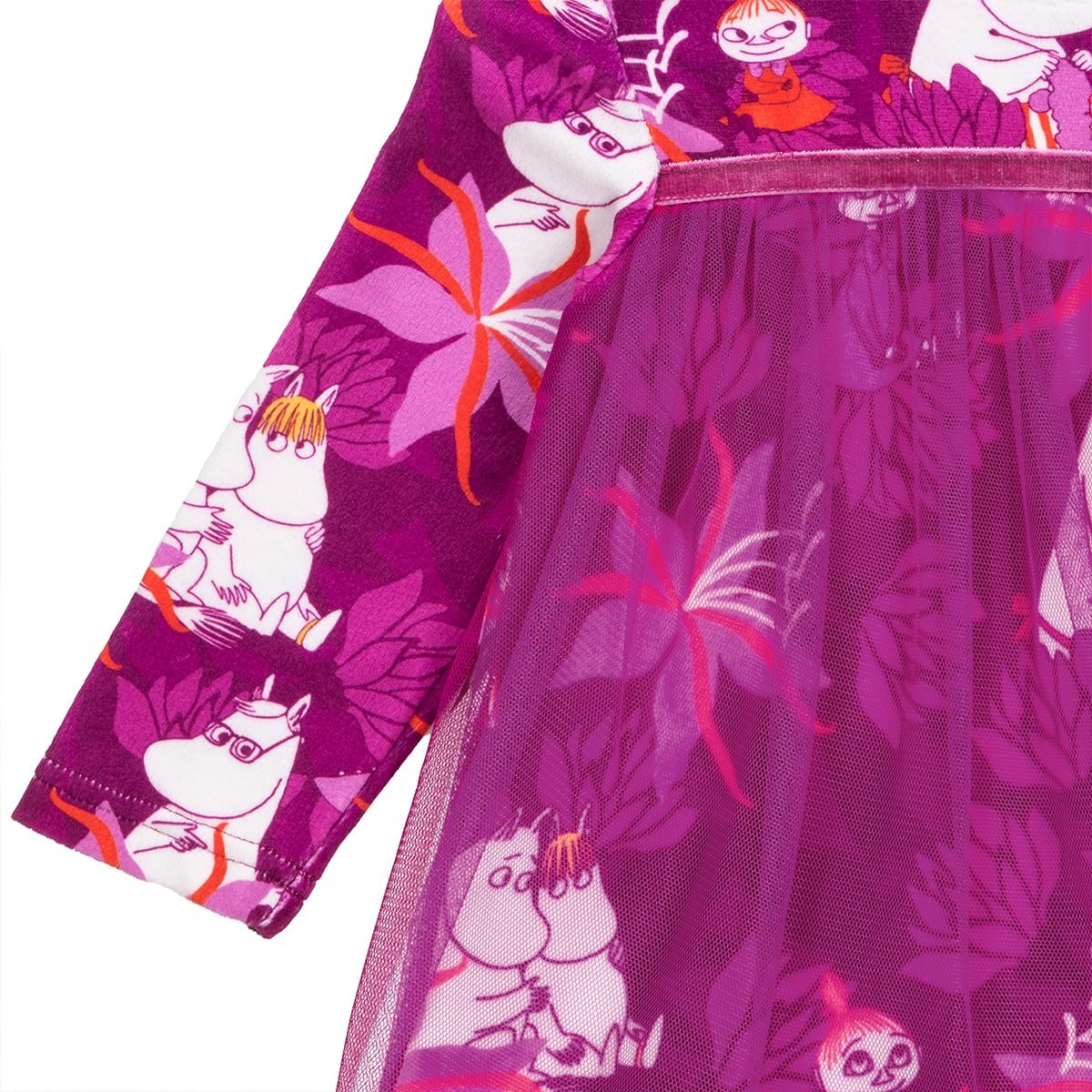 En fantastiskt mjuk och mysig Mumin velourklänning för baby. Med långa ärmar och tryckknappar på ena axeln för lättare påklädning. Kjoldel med två lager: nederdelen är mjuk velour och övre delen lätt tyll. Klänningen är gjord av bomull.