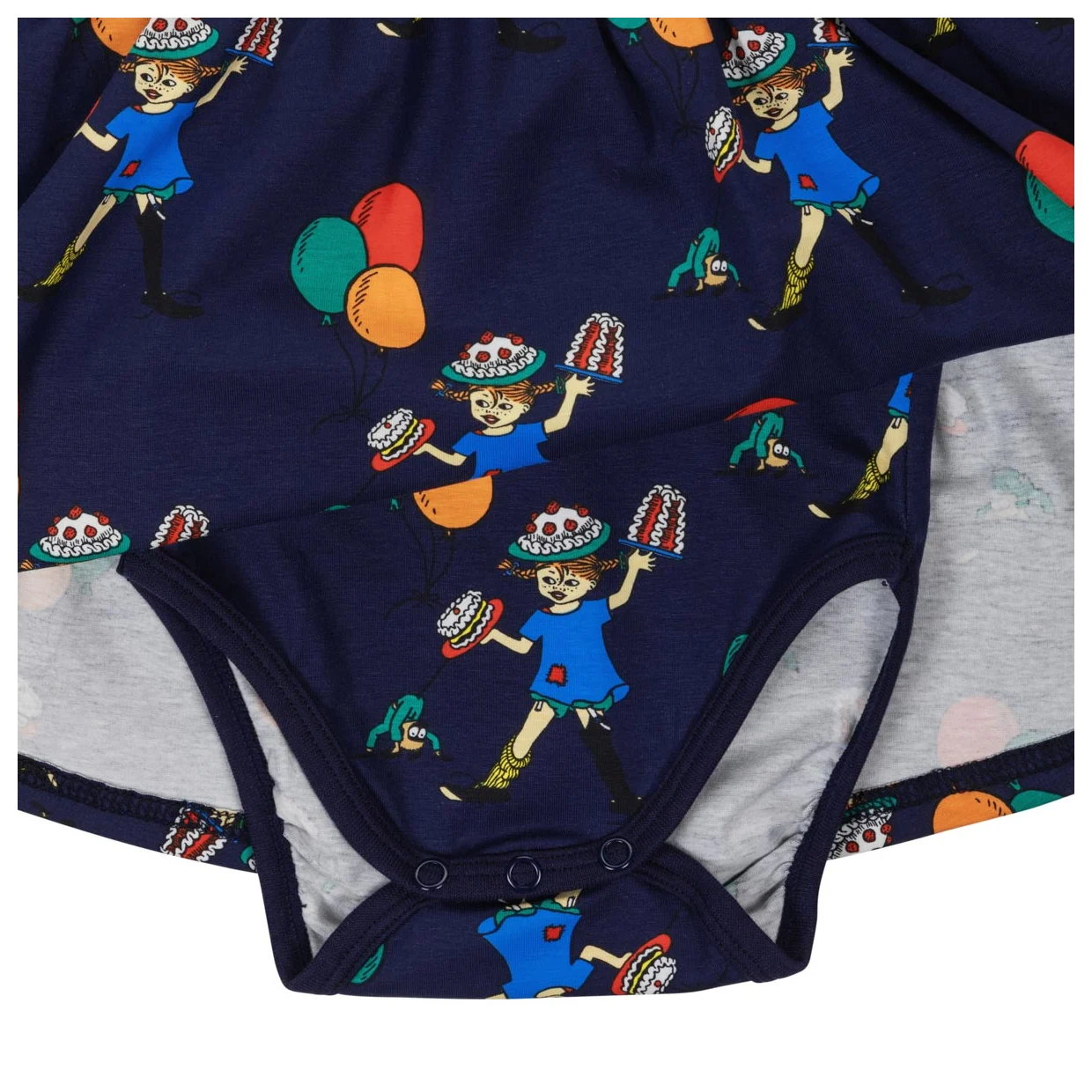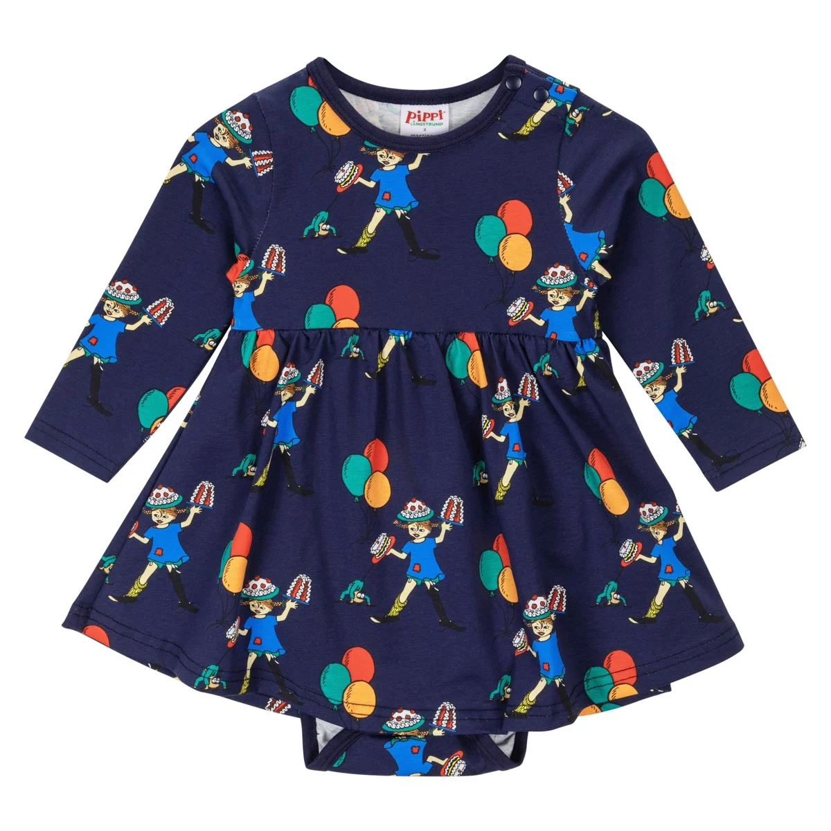 En mjuk och skön Pippi Långstrump bodyklänning för baby. Lång ärm, rund halsringning, tryckknappar på ena axeln och i grenen. Avskuren i midjan med rynk för fin och utställd kjoldel. Produkten innehåller certifierad ekologisk bomull.