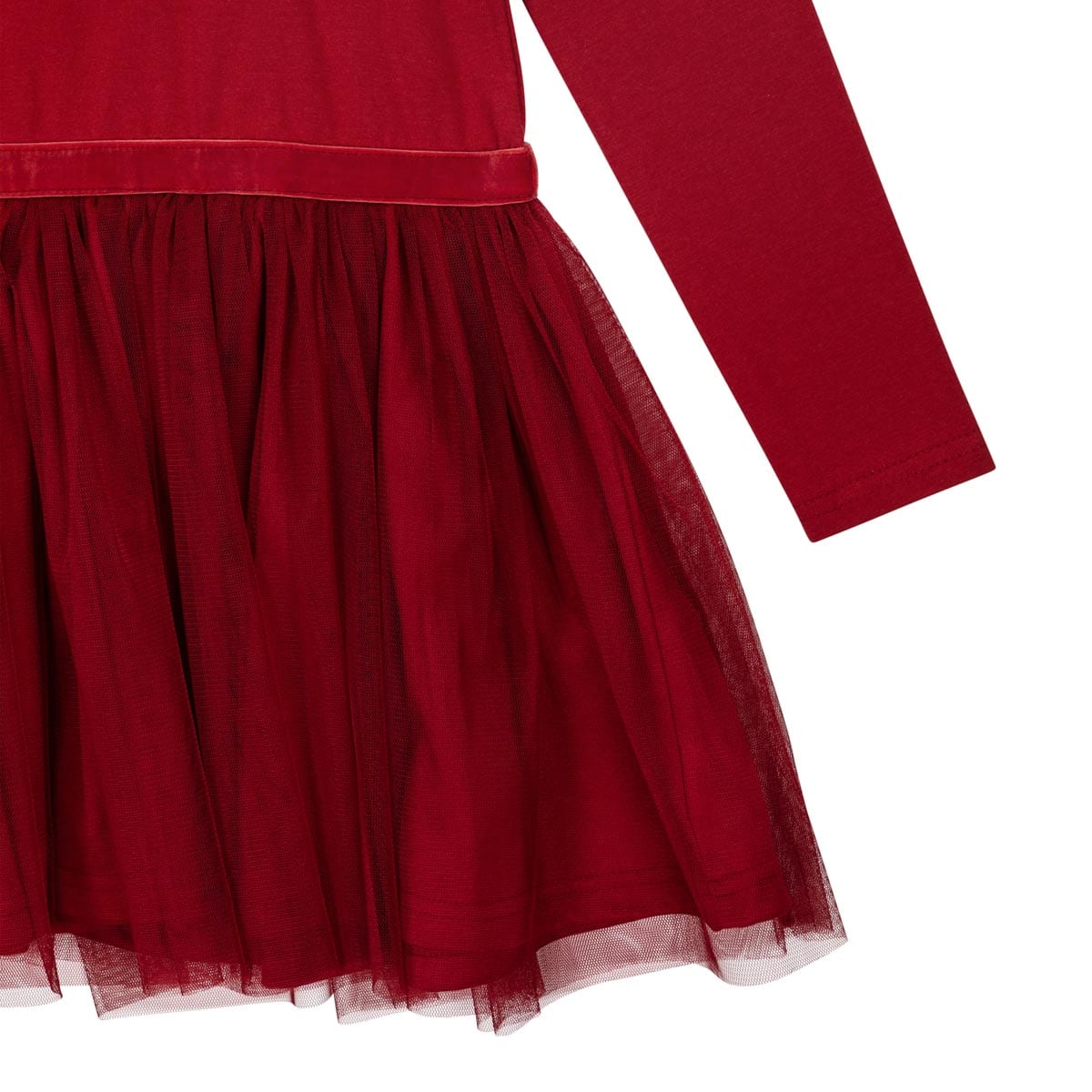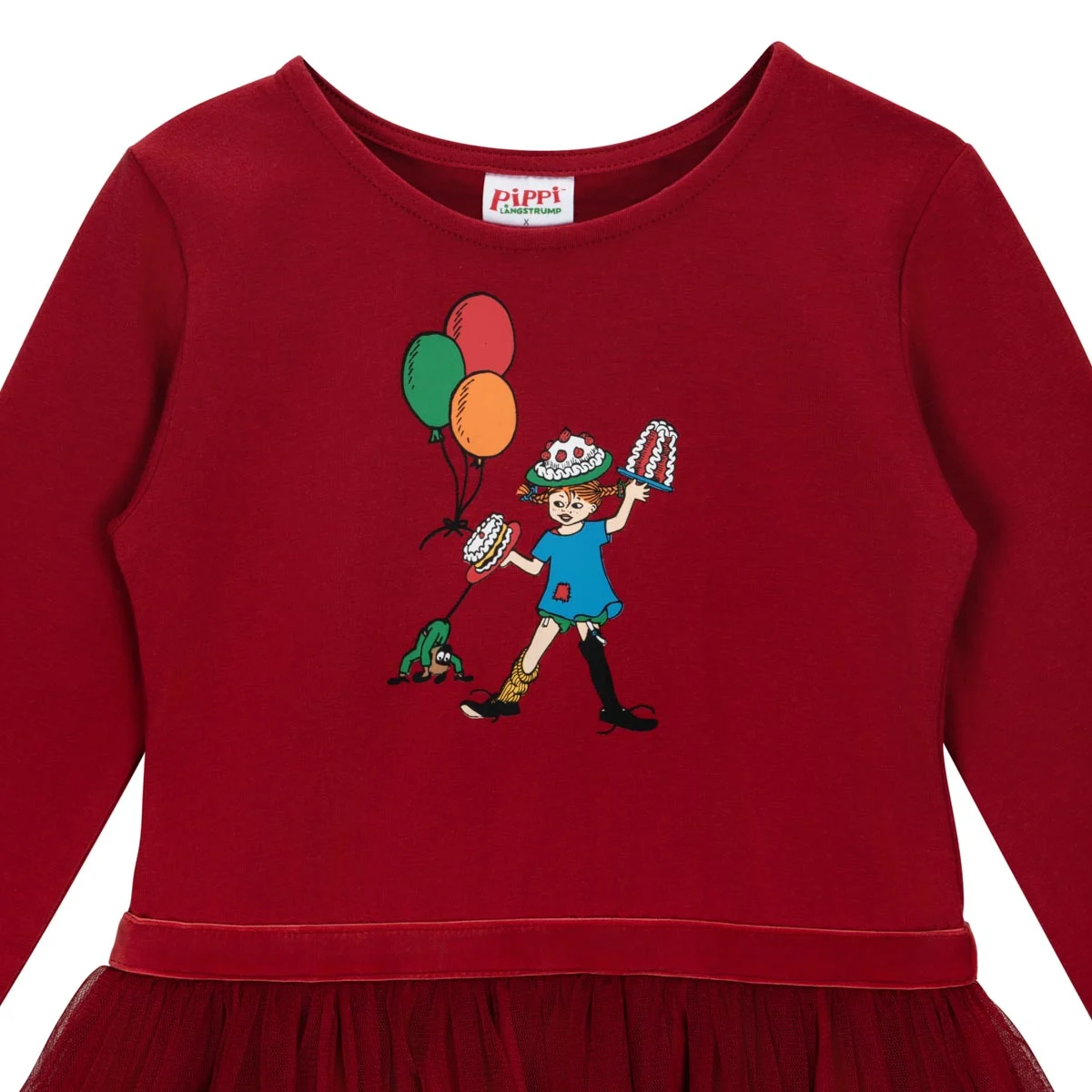 En mjuk och vacker Pippi Långstrump klänning för barn. Med lång ärm, rund halsringning, elastiskt sammetsband i midjan och kjoldel i mjukt fallande tyll. Produkten innehåller certifierad ekologisk bomull.