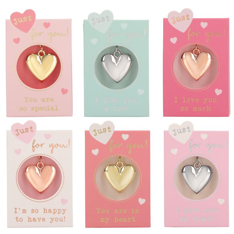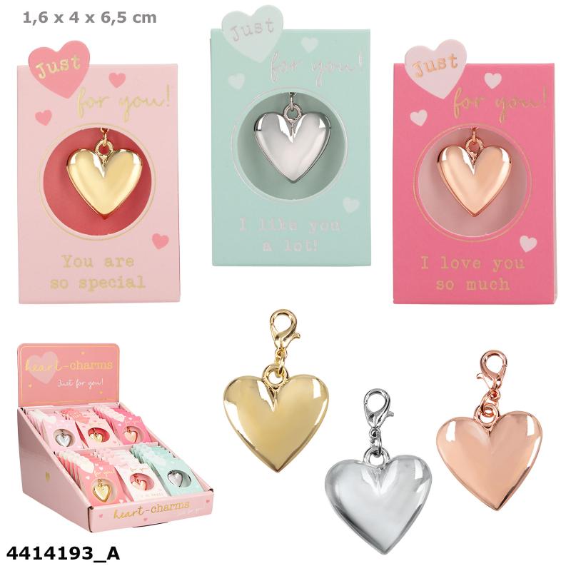 Dessa vackra hjärtformade hängen finns i silver, guld och roséguld (zinklegering) och har en liten, praktisk karbinhake. Hjärtat, inklusive karbinhaken, mäter ca 3 cm. De kan användas som berlocker på armband och halsband eller som dekorativa hängen på dragkedjor, nyckelringar etc. Perfekt som present tack vare den fina asken och en söt text. Finns i 6 olika text- och färgvarianter.