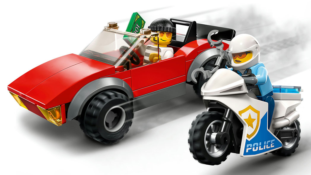 • Vad finns i lådan? – Allt barn behöver för att bygga en polismotorcykel och skurkens sportbil, plus polisförar- och skurkminifigurer