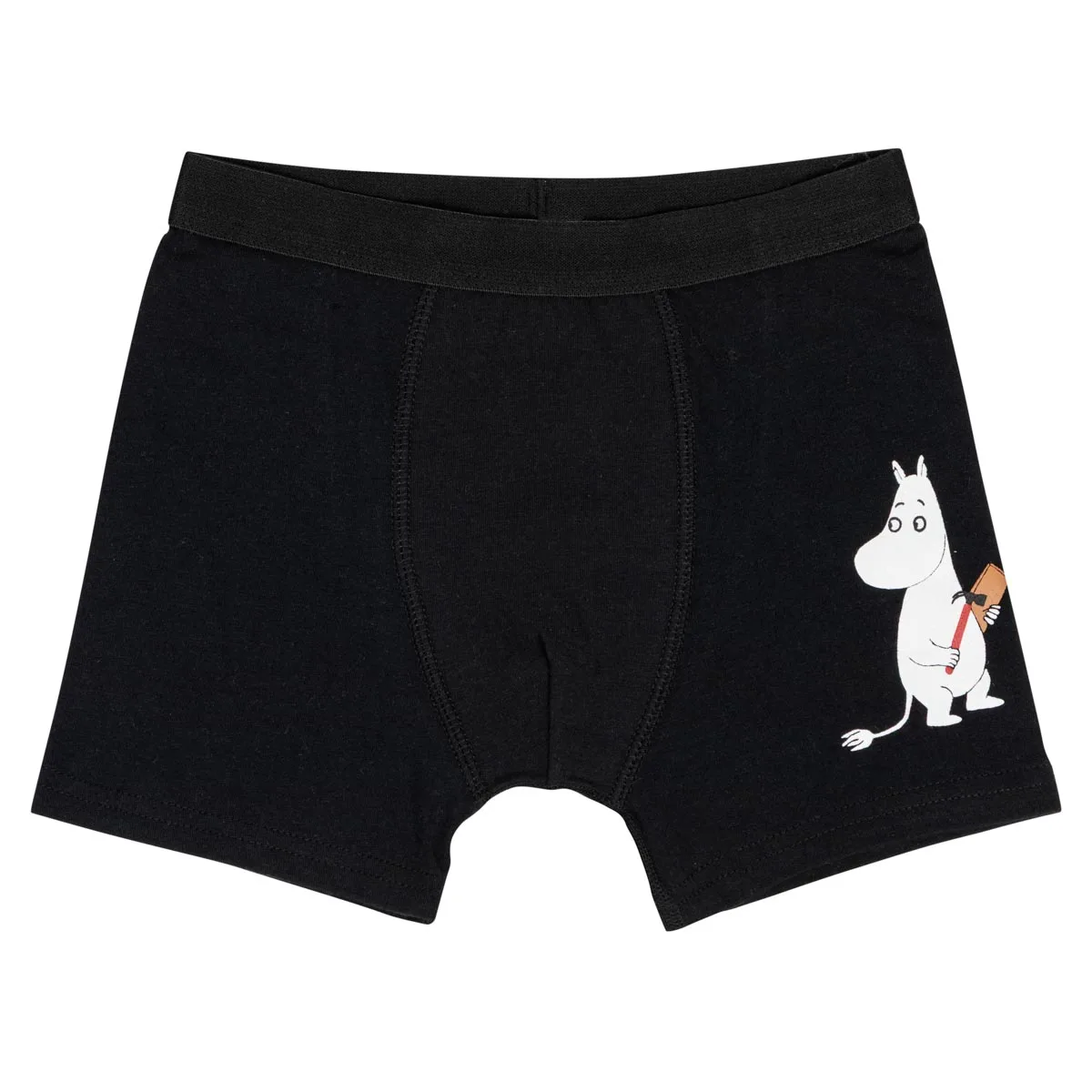 Två par Mumin boxerkalsonger för barn, en i svart med litet Mumintrollet-tryck, den andra i grått med fint helmönster. Kalsongerna har svart resår i midjan och fodrad front. Tillverkad i mjuk bomullsblandning. Öko-tex.