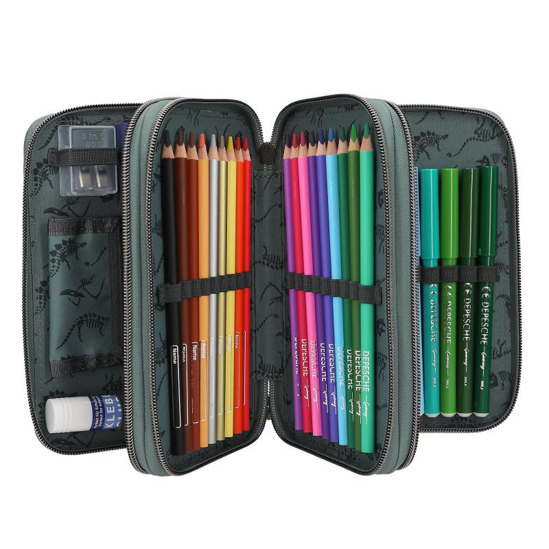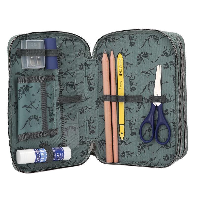 Detta grågröna pennfodral från Dino World BITE-serien har ett coolt dinosauriemotiv på framsidan och en logoskylt i metall på sidan. De tre separata facken är komplett fyllda med allt som behövs för att rita, skriva och pyssla: vardera 18 färg- och tuschpennor, 2 blyertspennor, pennvässare, suddgummi, linjal, sax, limstift samt en liten kardborreficka. Perfekt att ha med på resor, till skolan samt för hemmapyssel.