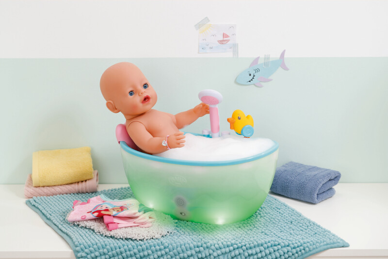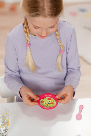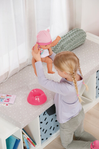 BABY born Emma ger massor med skojiga lekar i barnkammaren med sina 10 verklighetstrogna funktioner. Hon kan dricka, bada, potträna, blunda när nappen vrids och mycket mera. Hon äter från sin lilla tallrik där maten på ett magiskt sätt blir synlig. Jag undrar vad som ligger på hennes tallrik i dag? Förutom den magiska tallriken och pottan kommer hon med massor av tillbehör för att göra den klassiska dockteatern kreativ och rolig. Från 3 år. Innehåller: – BABY born Emma docka 43 cm inkl. sparkdräkt och luva – potta (vattenmagi), blöja, tallrik (matmagi), skred, flaska, magisk napp – födelsebevis – kompisarmband för barn och docka