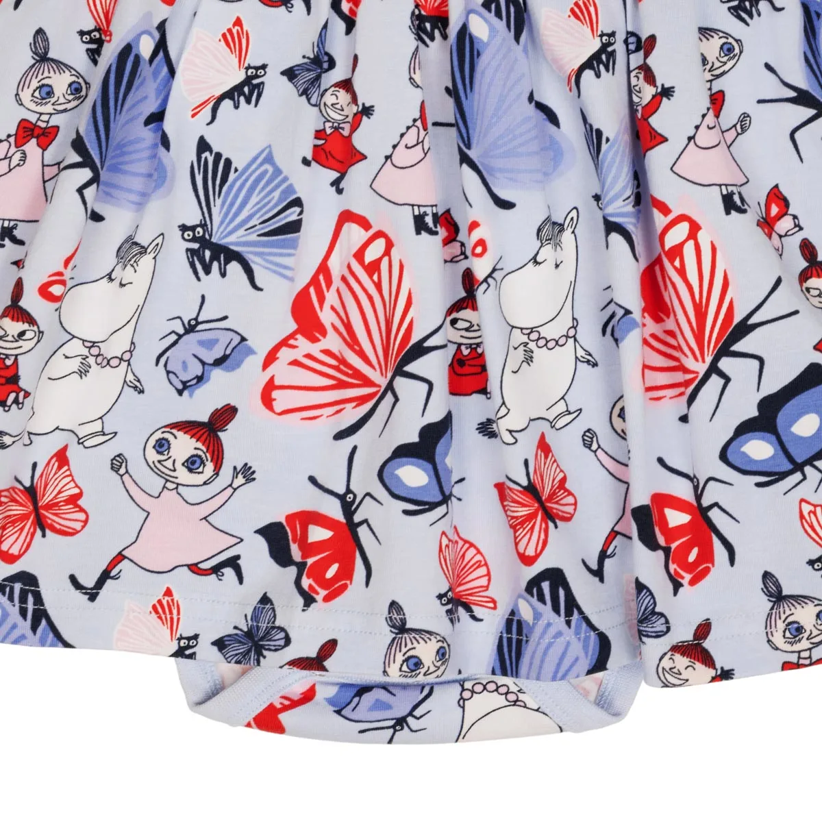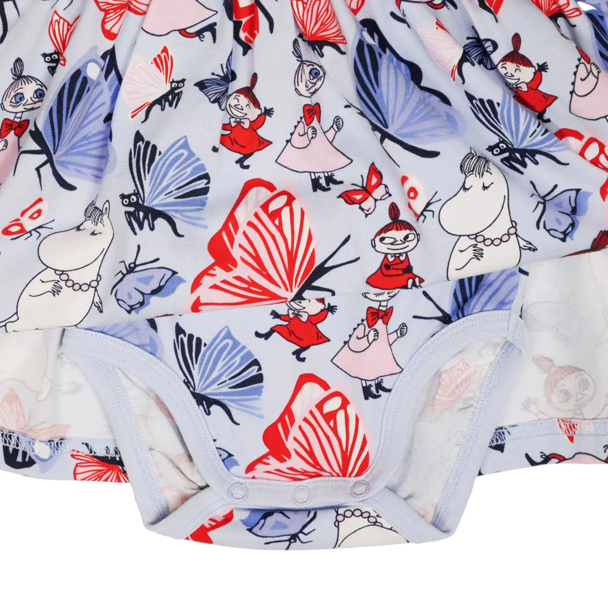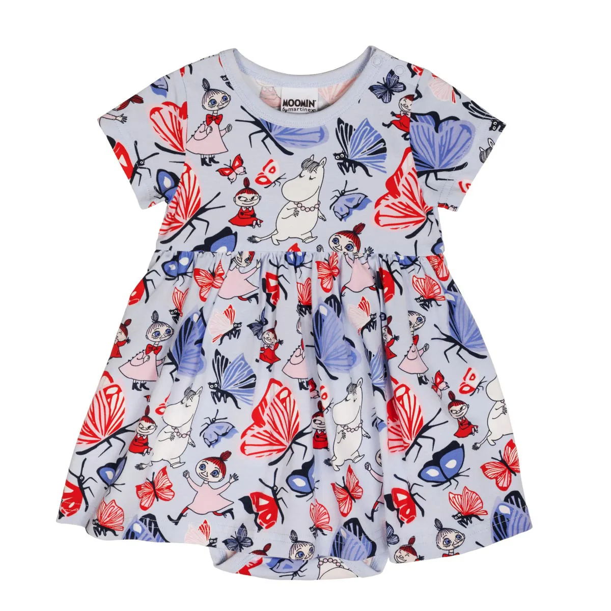 En mjuk och mysig Mumin bodyklänning för baby. Kort ärm, rund halsringning, tryckknappar på ena axeln och i grenen. Avskuren i midjan med rynk för fin och utställd kjoldel. Produkten innehåller certifierad ekologisk bomull. Öko-tex. Designad i Finland.