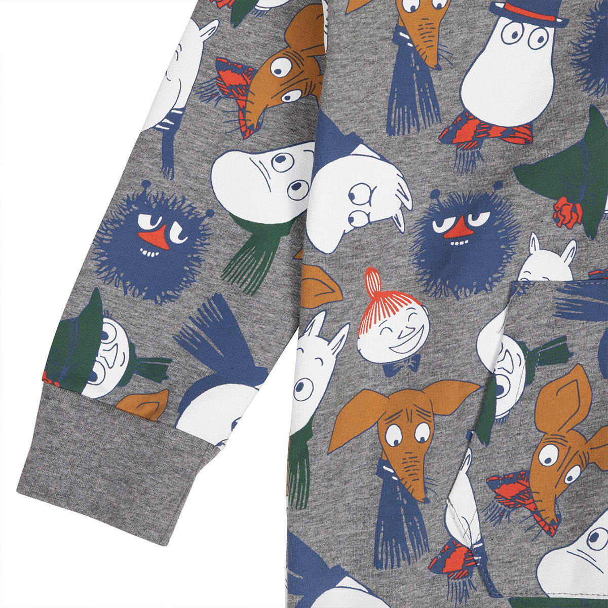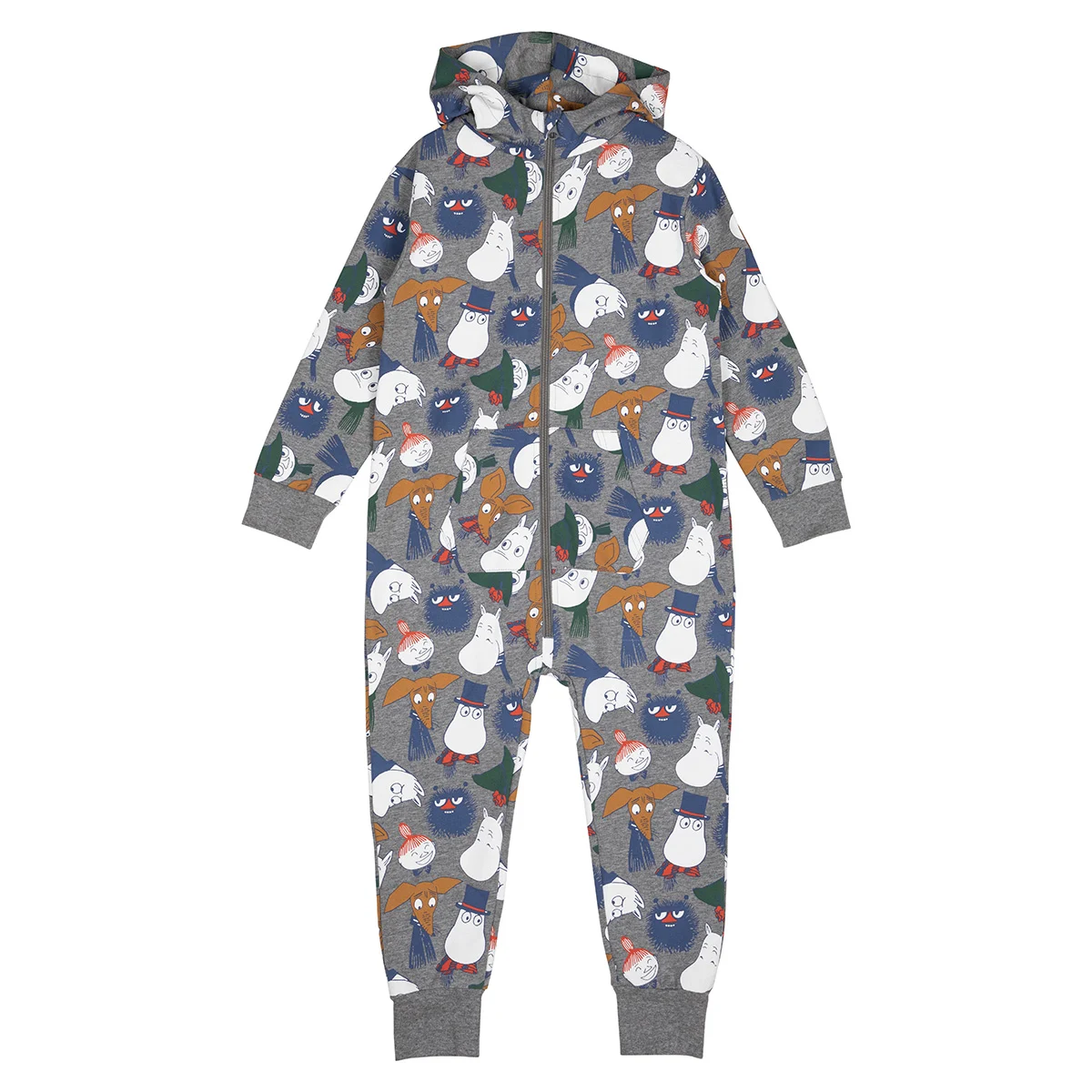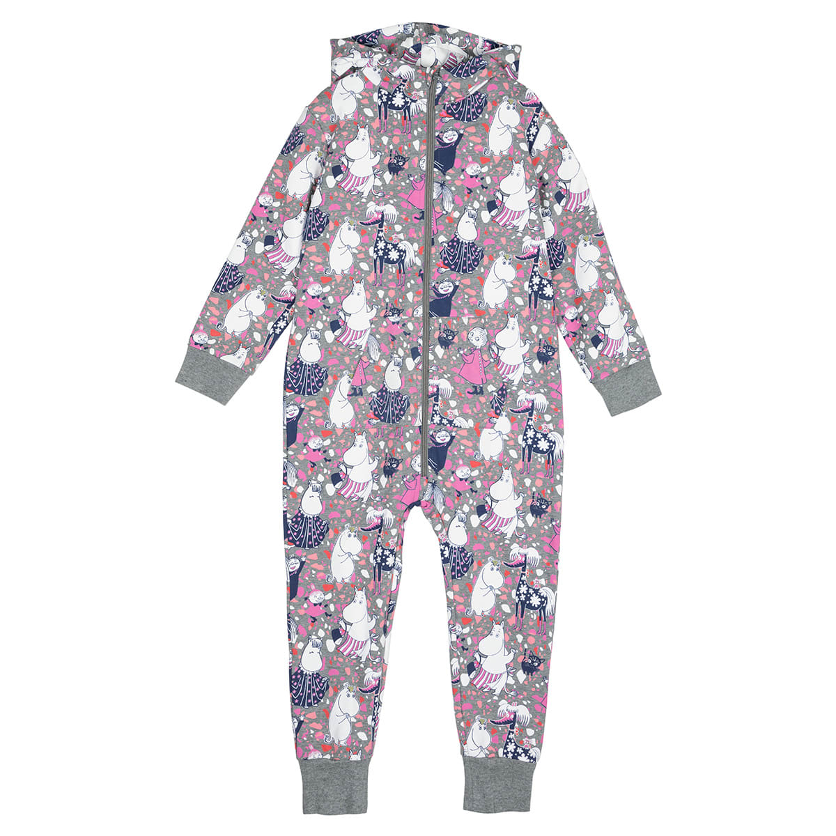 En mjuk och mysig Mumin overall för barn. Tillverkad i sweatshirtkvalitet med mjukt borstad insida. Lång ärm, fodrad huva, långt blixtlås framtill samt ribbade muddar i ärm- och bensluten. Produkten innehåller certifierad ekologisk bomull. finns i 2 varianter