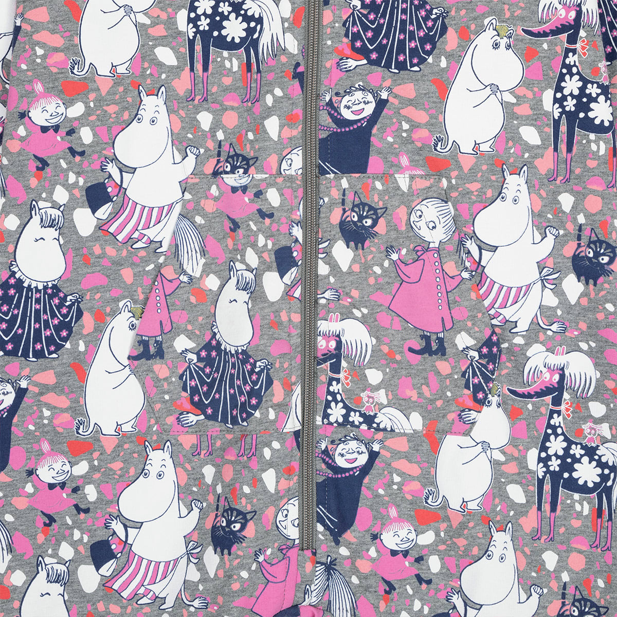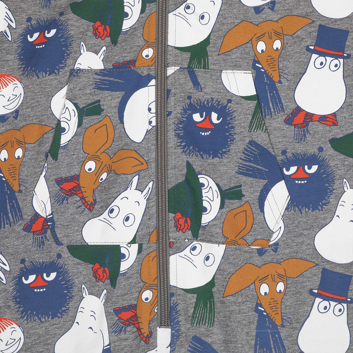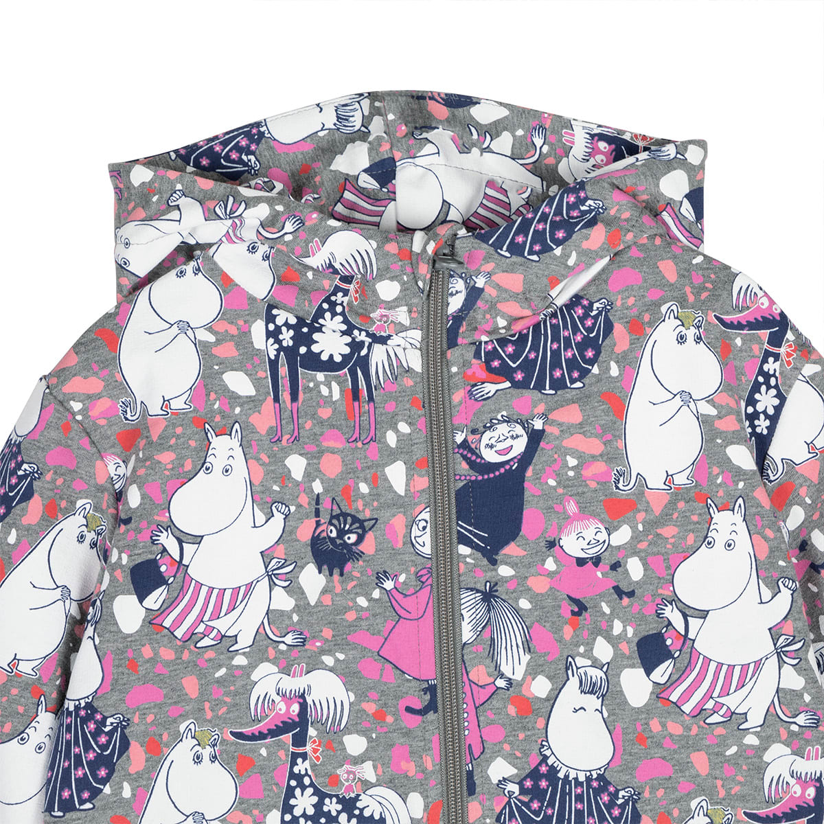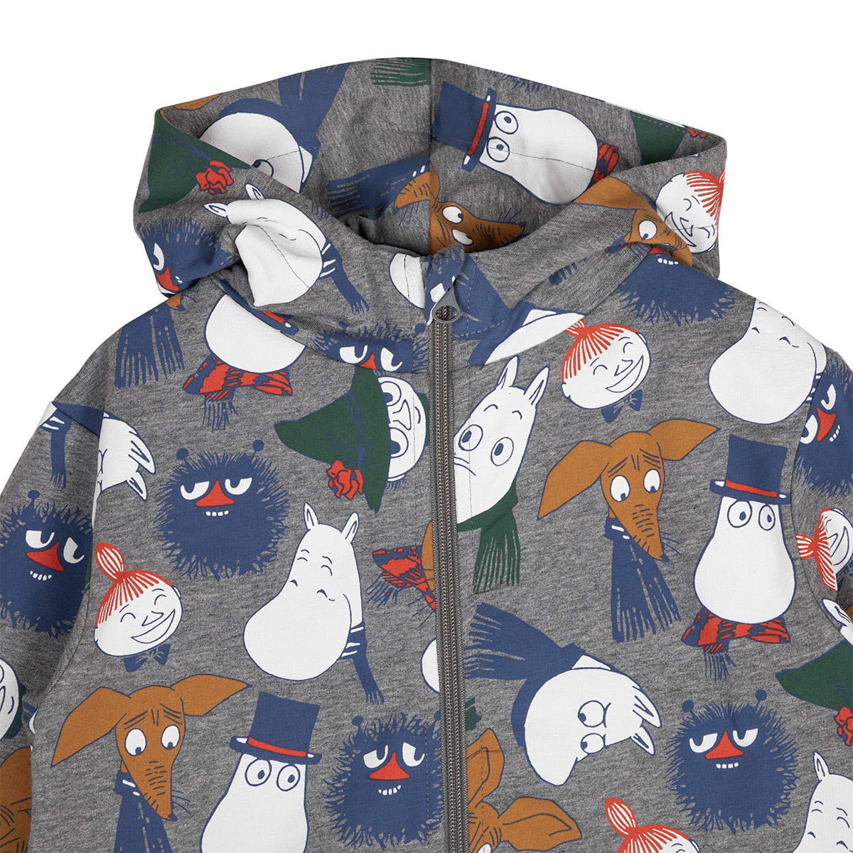 En mjuk och mysig Mumin overall för barn. Tillverkad i sweatshirtkvalitet med mjukt borstad insida. Lång ärm, fodrad huva, långt blixtlås framtill samt ribbade muddar i ärm- och bensluten. Produkten innehåller certifierad ekologisk bomull. finns i 2 varianter
