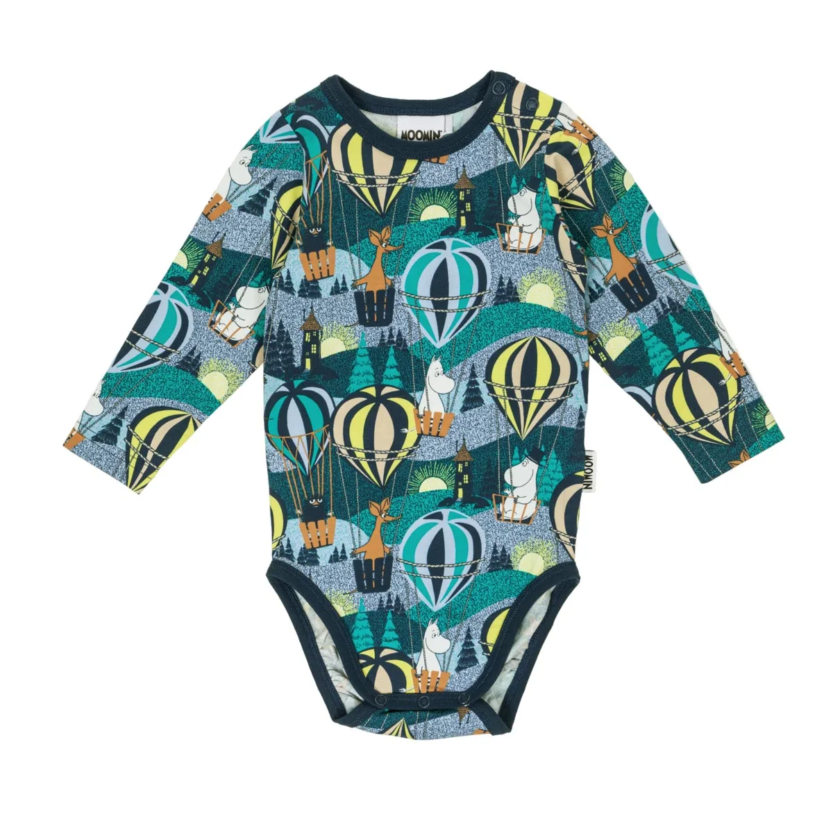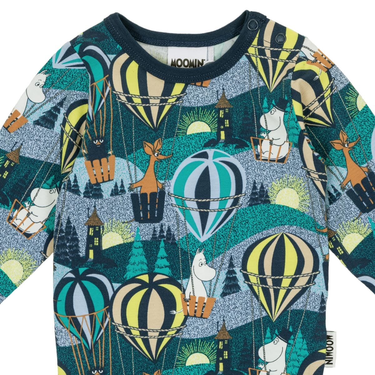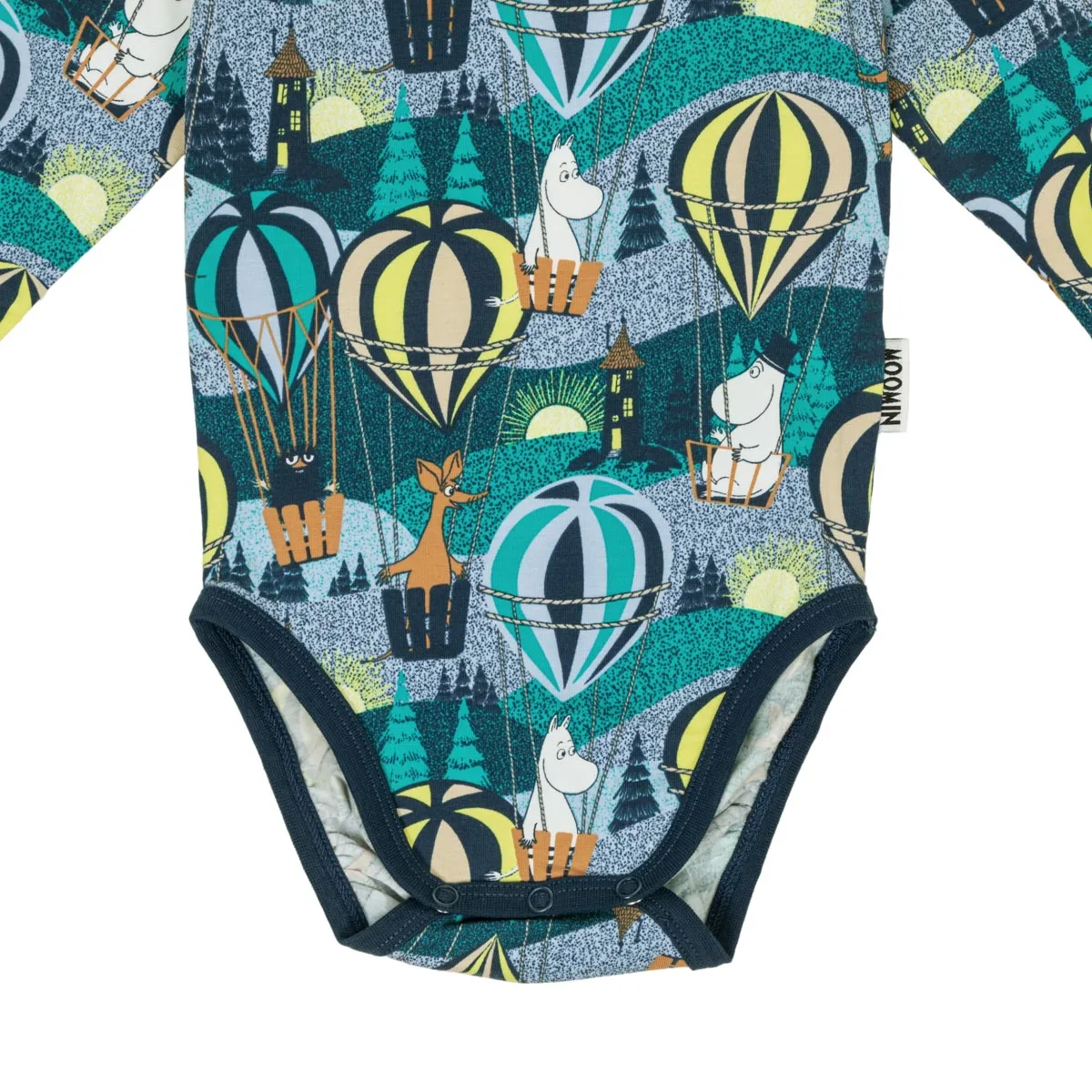 En mjuk, muminmönstrad babybody tillverkad i 95 % certifierad ekologisk bomull och 5 % elastan. Lång ärm, tryckknappar på ena axeln som underlättar påklädning, samt tryckknappar i grenen för blöjbyte. Öko-tex. Designad i Finland.