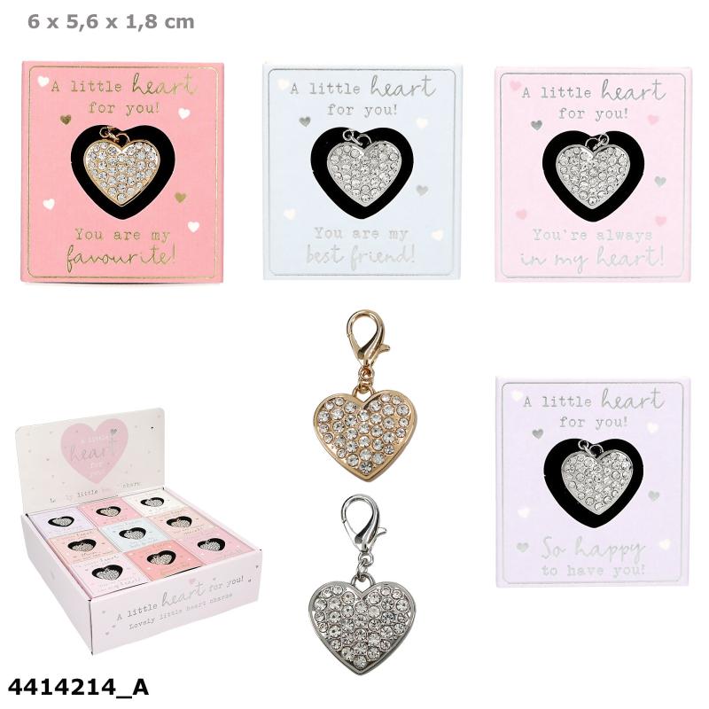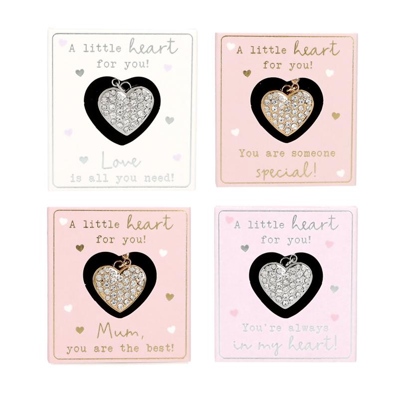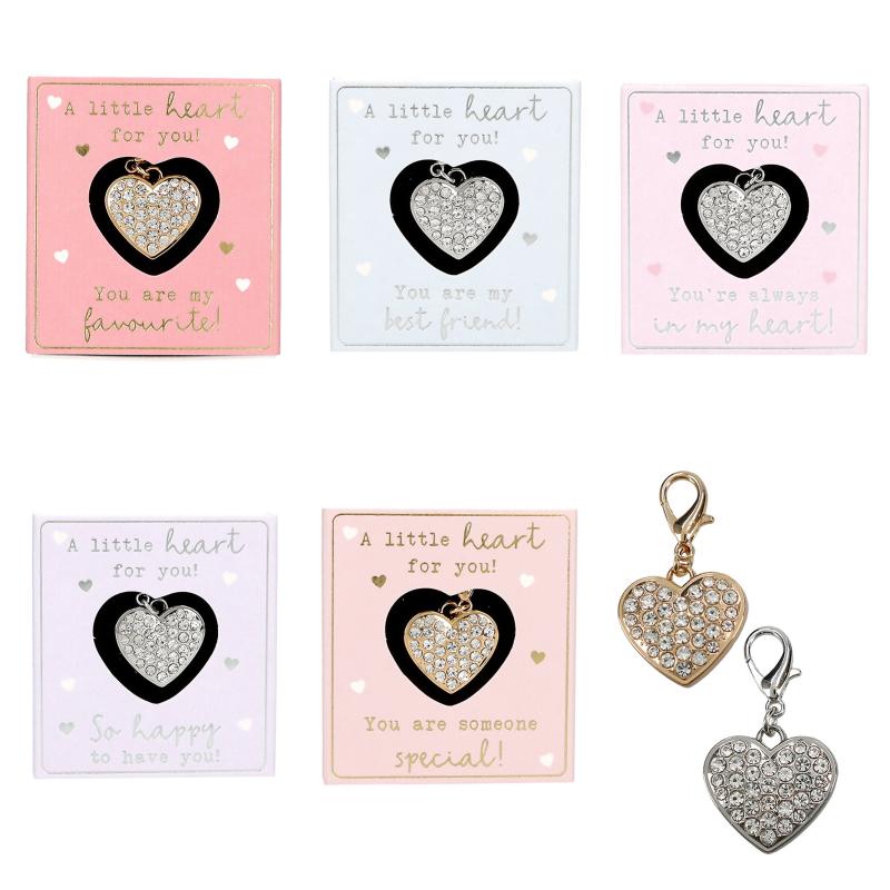 Dessa vackra hjärtformade silver- eller guldfärgade hängen med glitterstenar har en liten, praktisk karbinhake. De kan användas som dekorativt hänge på dragkedjor, nyckelringar, väskor etc. En perfekt present tack vare den vackra förpackningen med fönster och en söt text. Finns i 9 olika textvarianter. Hjärtat, inklusive karbinhaken, mäter ca 3,7 cm.