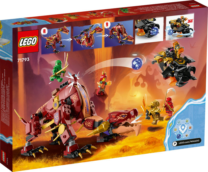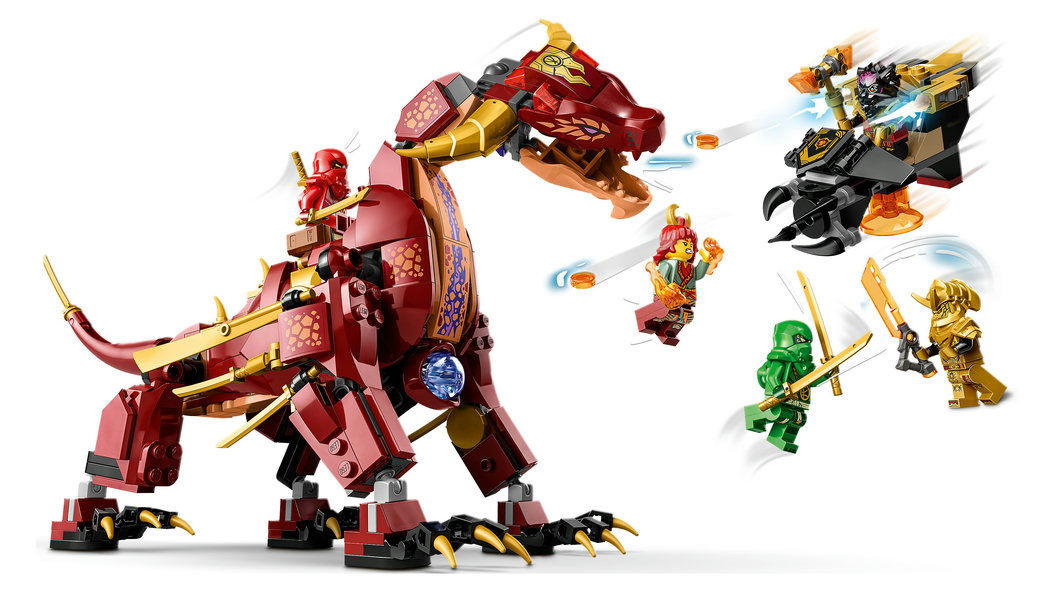 • Ninjaleksak med drake – Entusiastiska ninjafans från 8 år kan iscensätta strider från tv-serien NINJAGO® Dragons Rising med leksetet Heatwaves omvandlingsbara lavadrake (71793)