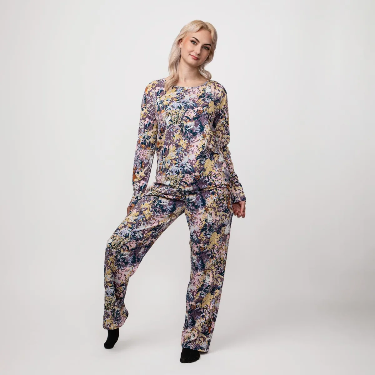 En mjuk och mysig tvådelad Mumin pyjamas för damer. Tröjan har långa ärmar och rund halsringning. Byxan har långa, raka ben och elastisk midja. Tillverkad i mjuk bomull. Öko-tex. Modellen är 173 cm lång och bär storlek M.