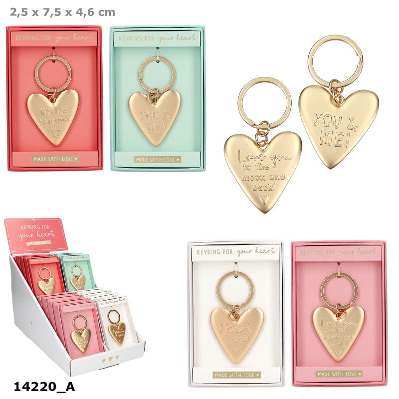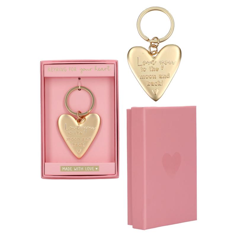 Dessa vackra, guldfärgade nyckelringar har ett stort hjärtformat hänge med graverad text. Kan användas som nyckelring för att hålla reda på dina nycklar eller fästas på din väska eller ryggsäck som ett vackert och personligt hänge. De är också perfekta som present tack vare den vackra förpackningen i fina färger med guldtext. Finns i 4 olika färg- och textvarianter: YOU & ME!, BETTER together, Love you to the moon and back! och Heart of gold.