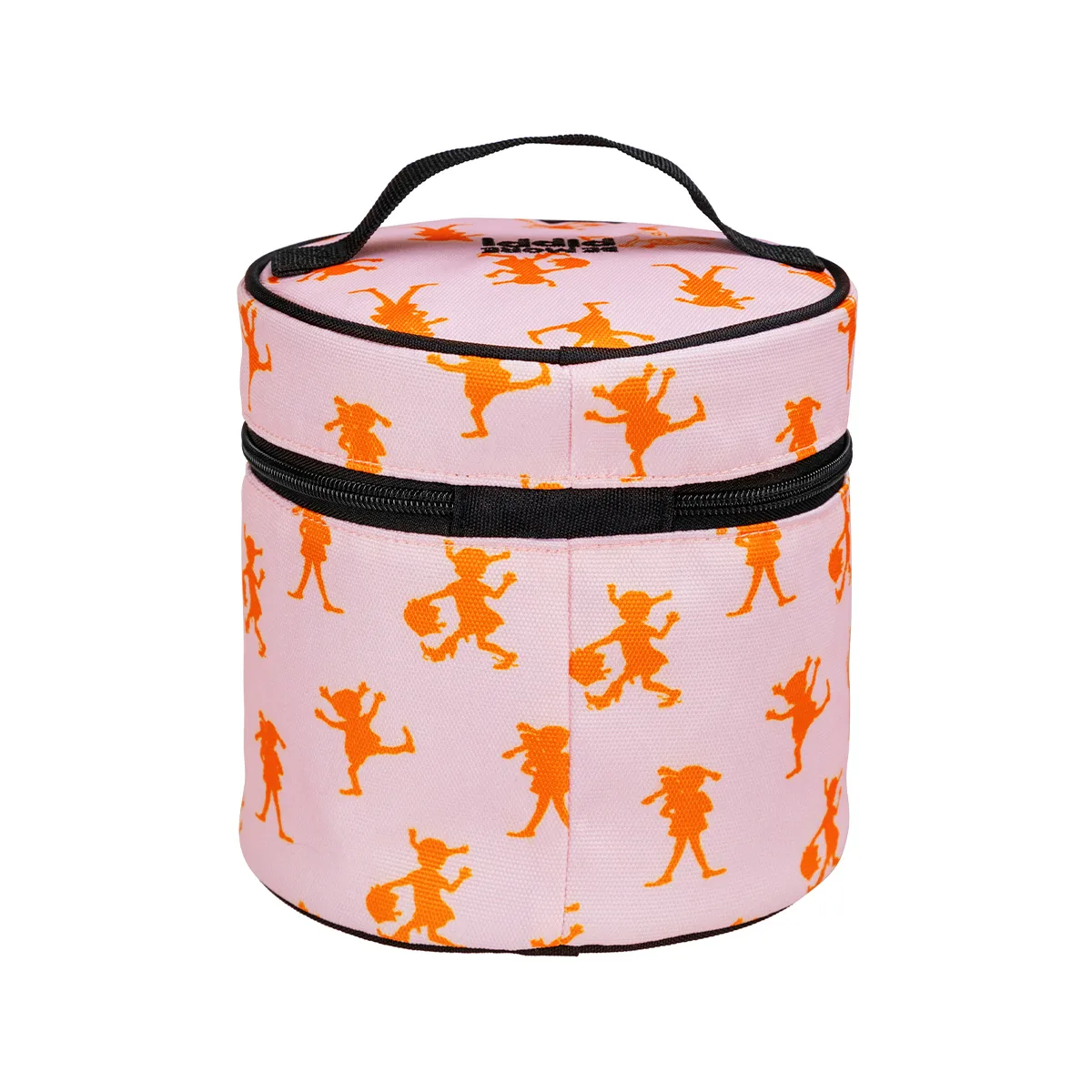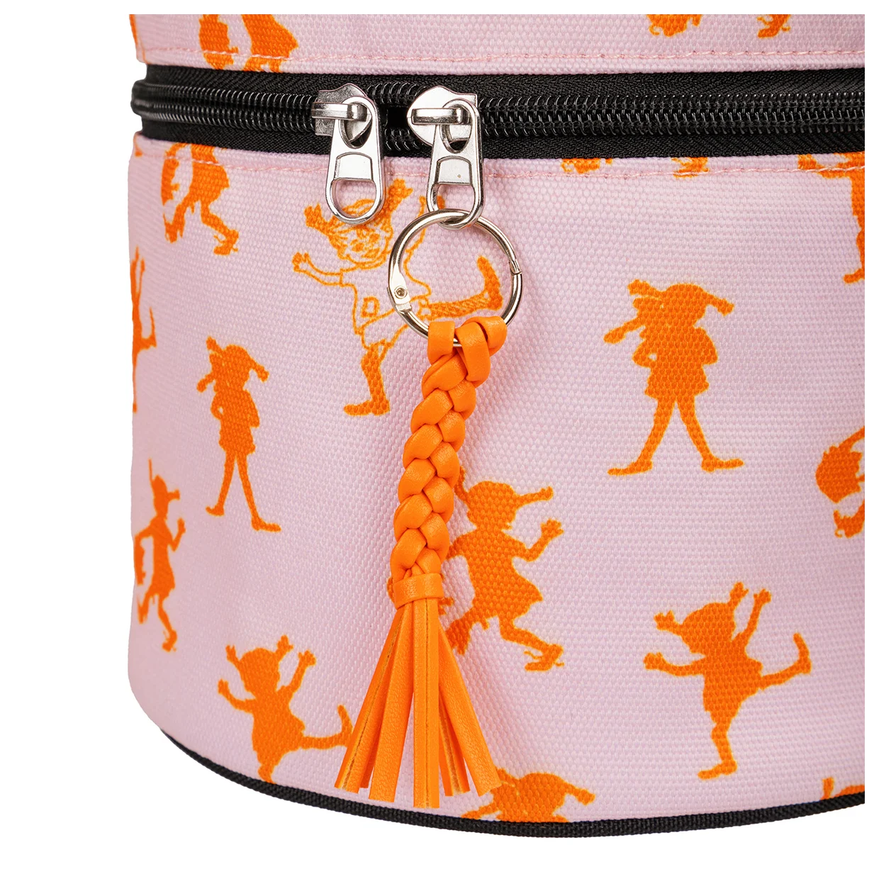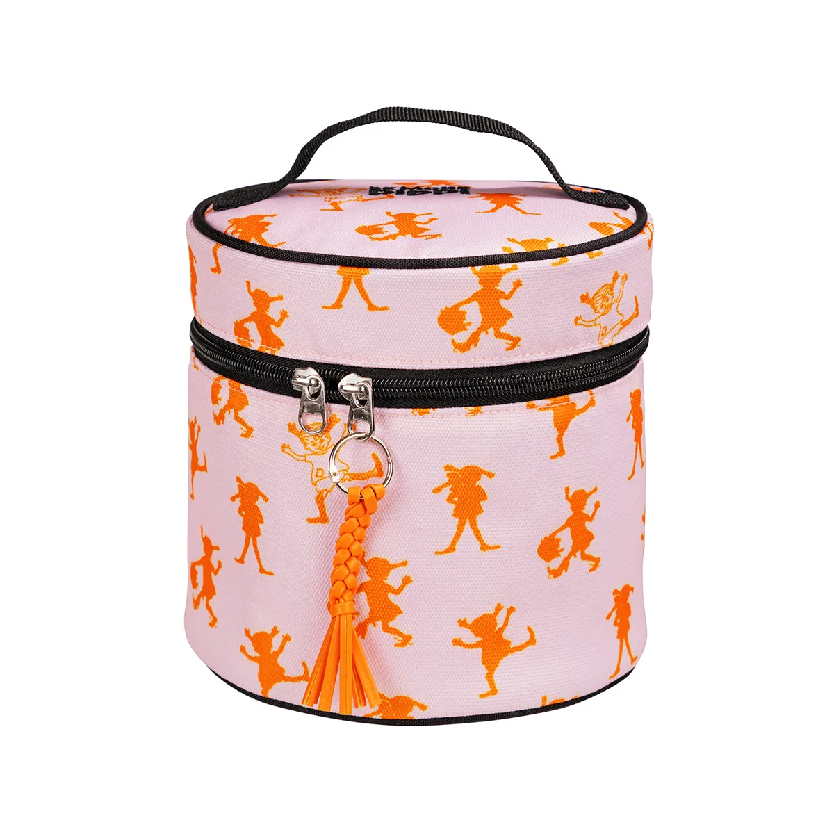 Cylinderformad Pippi Långstrump necessär tillverkad i stadig, lätt stoppad polyestercanvas. Necessären är rosa och helmönstrad med orange Pippi-figurer. Blixtlås med flätad dragtapp, bärhandtag upptill, samt den broderade texten ’Be more Pippi’. Inga innerfickor. Metalldelarna är silverfärgade.