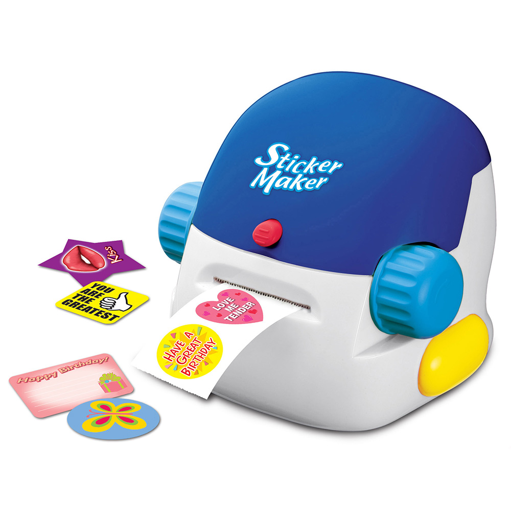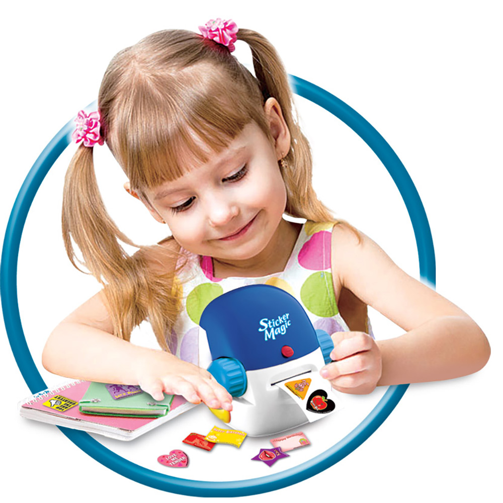 Med denna klistermärkesmaskin kan barn skapa sina egna unika klistermärken. Setet innehåller 76 färdigdesignade bilder och 2 meter klistermärkespapper, men det bästa är att barnen även kan rita egna motiv eller klippa ut bilder från tidningar och göra klistermärken av dem. Mata bara in bilden på baksidan av maskinen, vrid på rattarna – och ut kommer ditt helt egna klistermärke. En kreativ och engagerande aktivitet som passar perfekt för små konstnärer!