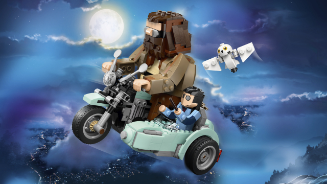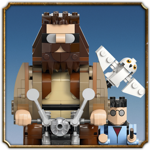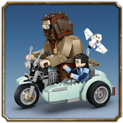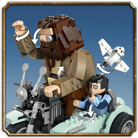 • 3 klossbyggda LEGO® Harry Potter™ karaktärer – Modellenhar inbyggda, rörliga leksaksfigurer av Harry Potter, Hedwig™ och Rubeus Hagrid™ som åker på Hagrids flygande motorcykel och i sidovagnen
