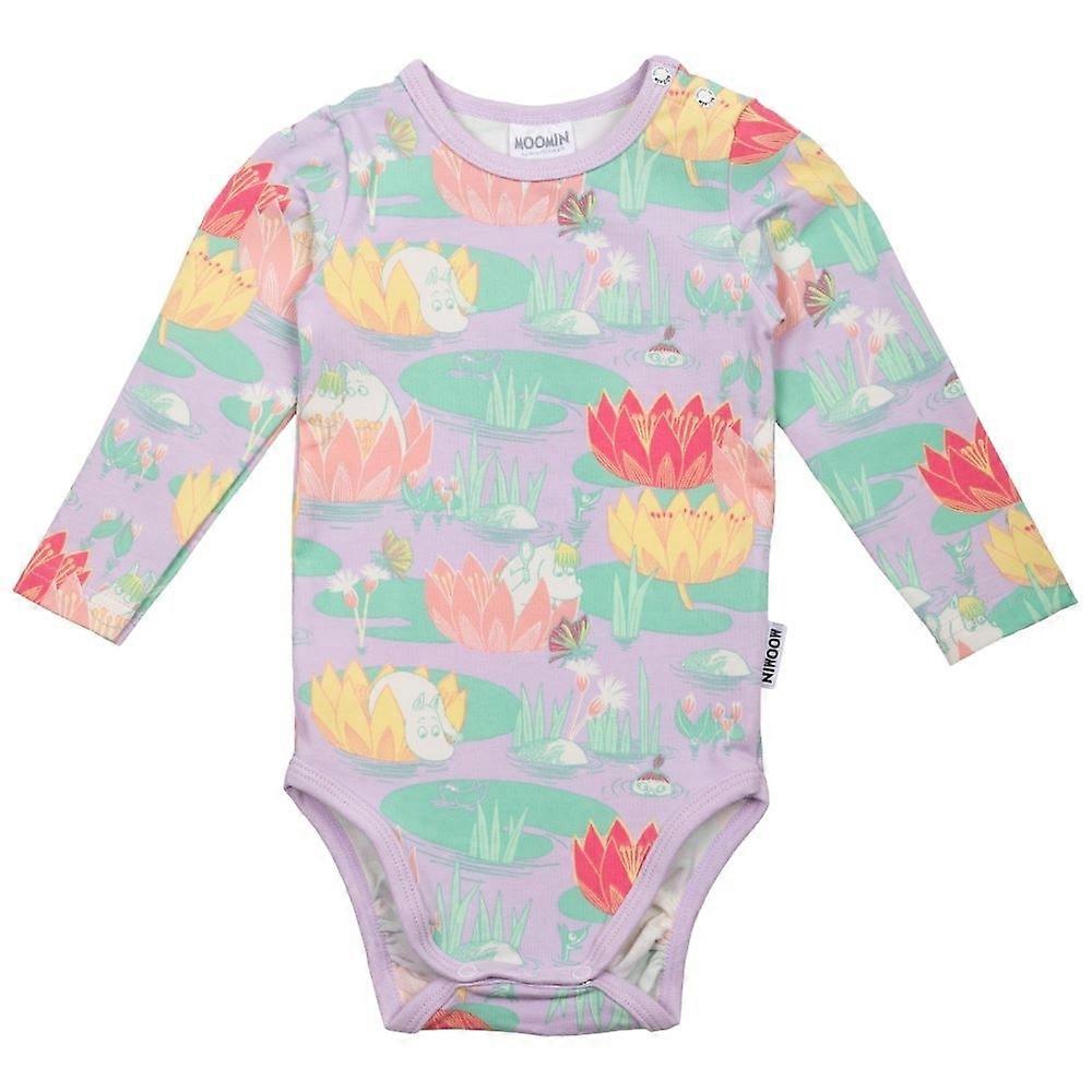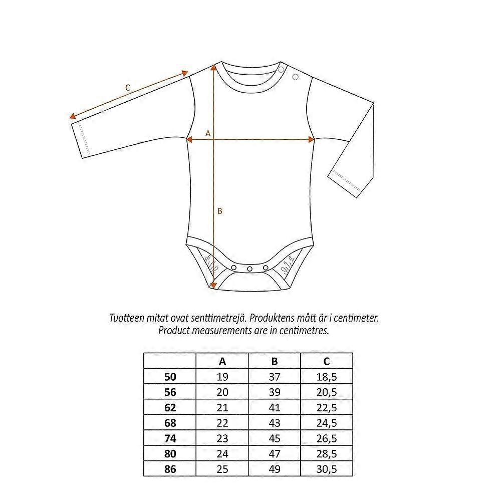 Mjuk och bekväm Muminbody för baby. Långa ärmar och tryckknappar på ena axeln och i grenen. Produkten innehåller certifierad ekologisk bomull. Material: 95 % ekologisk bomull, 5 % elastan Maskintvätt 40 grader. Tvättas med liknande färger. Tvättas ut och in. Torktumlas ej.