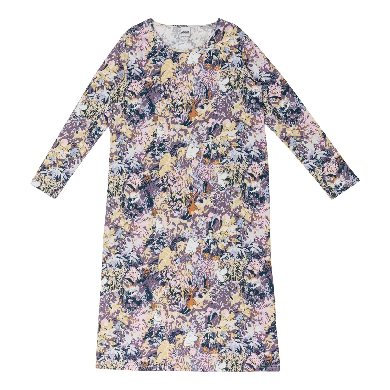 Färgglad långärmad nattlinne med A-linjeformad passform och det rikliga lövtrycket med Mymlan, Lilla My och Snorkfröken i huvudrollerna.