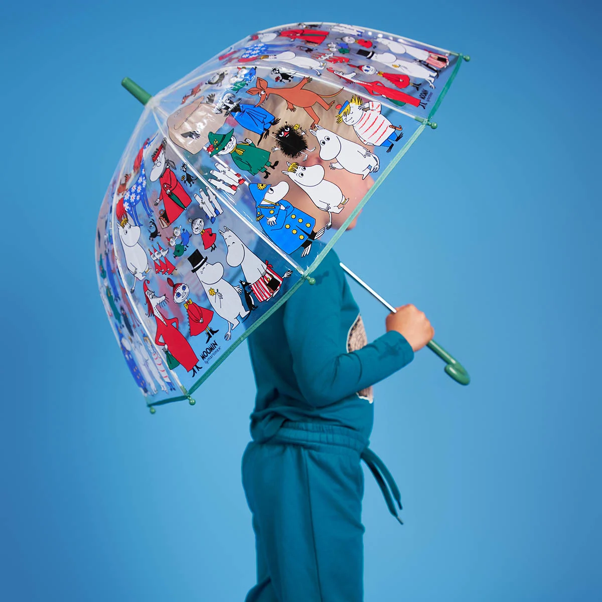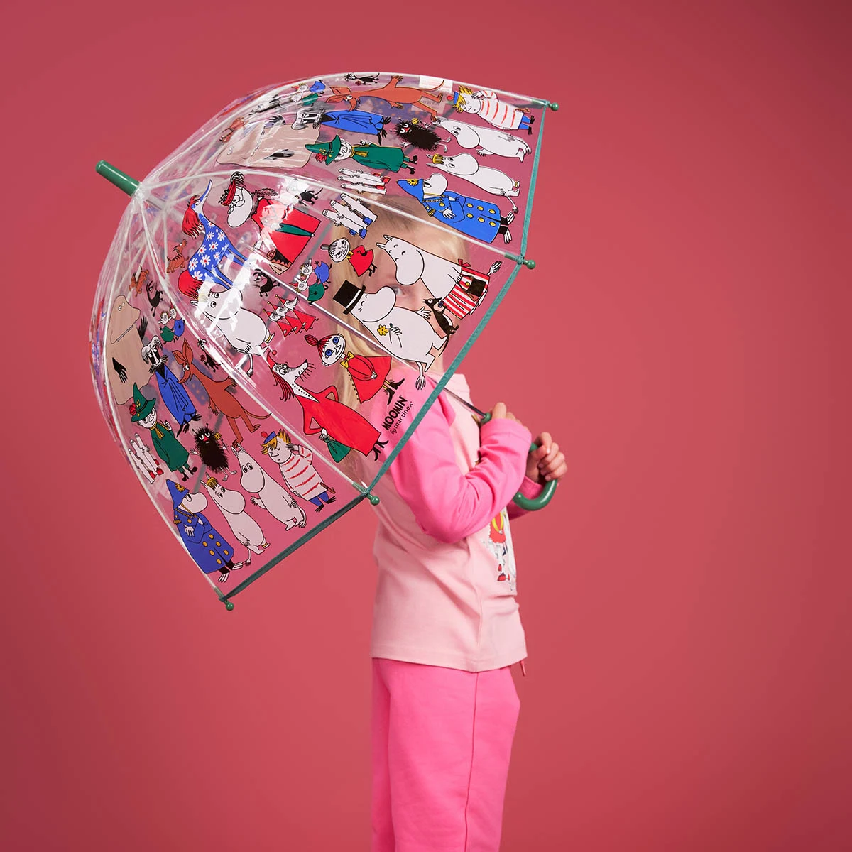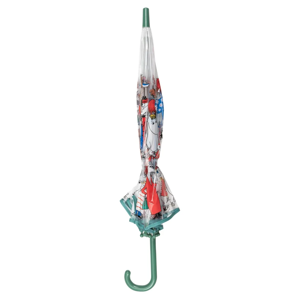 Ett stadigt Mumin paraply med metallram och paneler av genomskinlig plast. Fälls ihop manuellt. Diameter 71 cm. Åldersrekommendation 3+