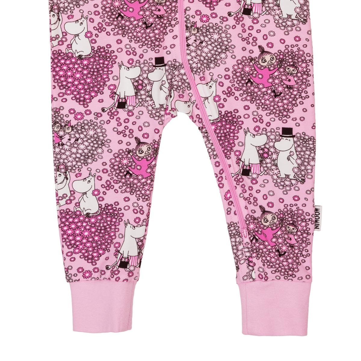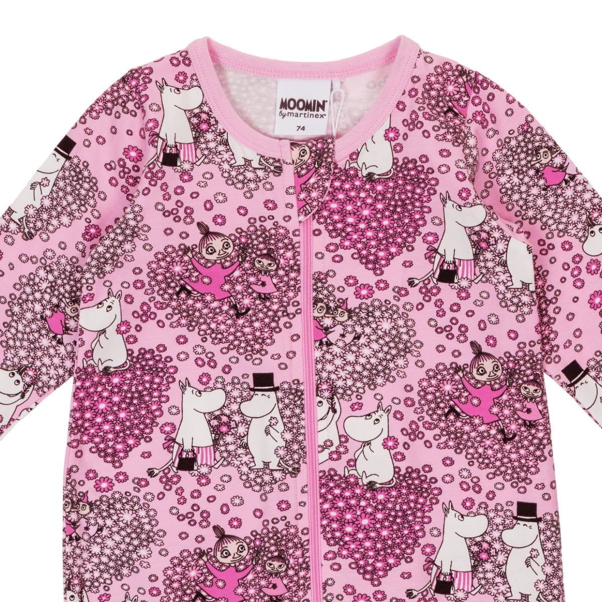 En mjuk, muminmönstrad babypyjamas tillverkad i 95 % certifierad ekologisk bomull och 5 % elastan. Lång ärm, mudd i bensluten, samt lång tvåvägsdragkedja som underlättar påklädning och blöjbyte. Öko-tex. Designad i Finland.