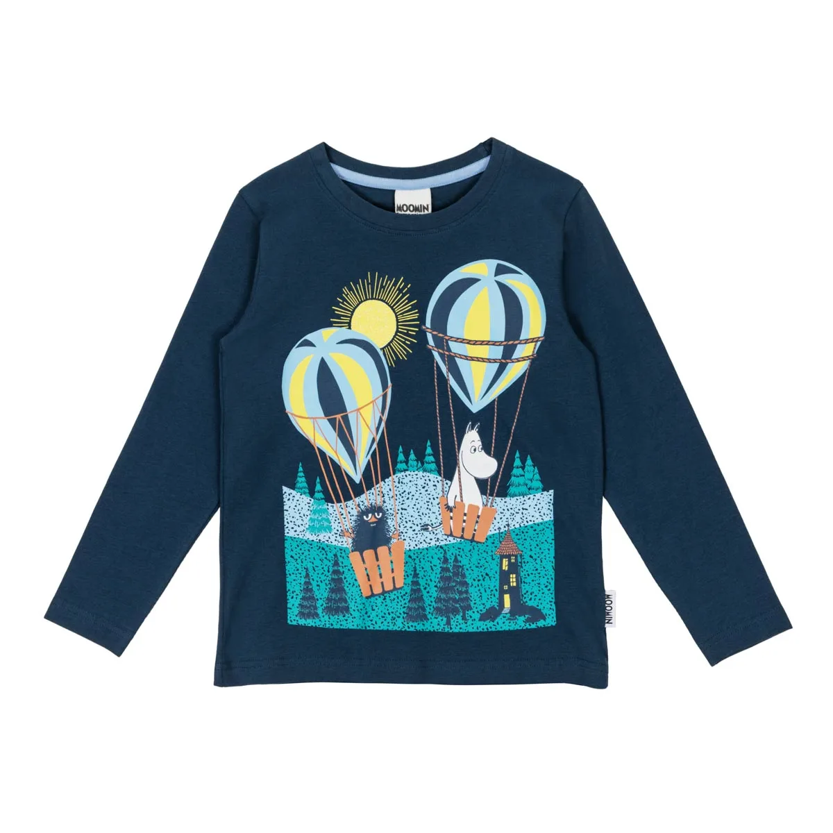 En mjuk, muminmönstrad barntröja tillverkad i 95 % certifierad ekologisk bomull och 5 % elastan. Rak modell med lång ärm och rund halsringning, stort rubbertryck framtill. Öko-tex. Designad i Finland.