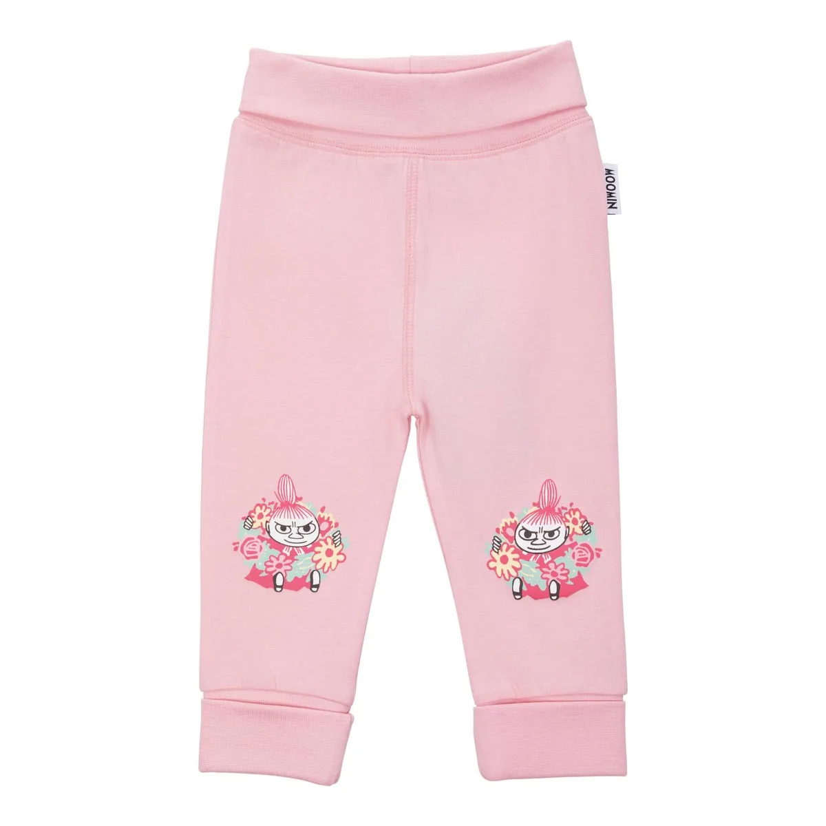En mjuk och skön Mumin byxa för baby. Byxan har vikbar resår i midjan och bensluten och roliga Lilla My-rubbertryck på knäna. Produkten innehåller certifierad ekologisk bomull.