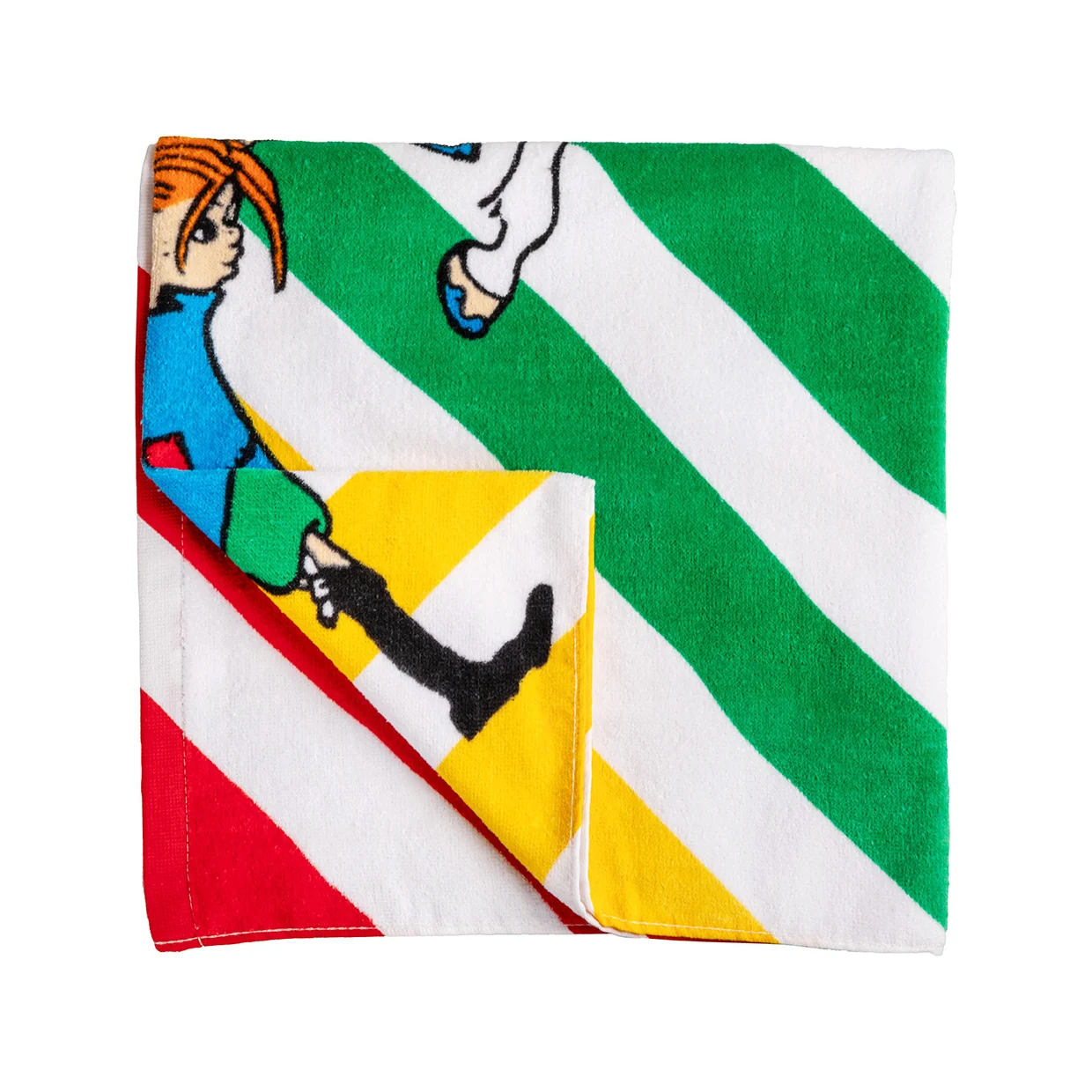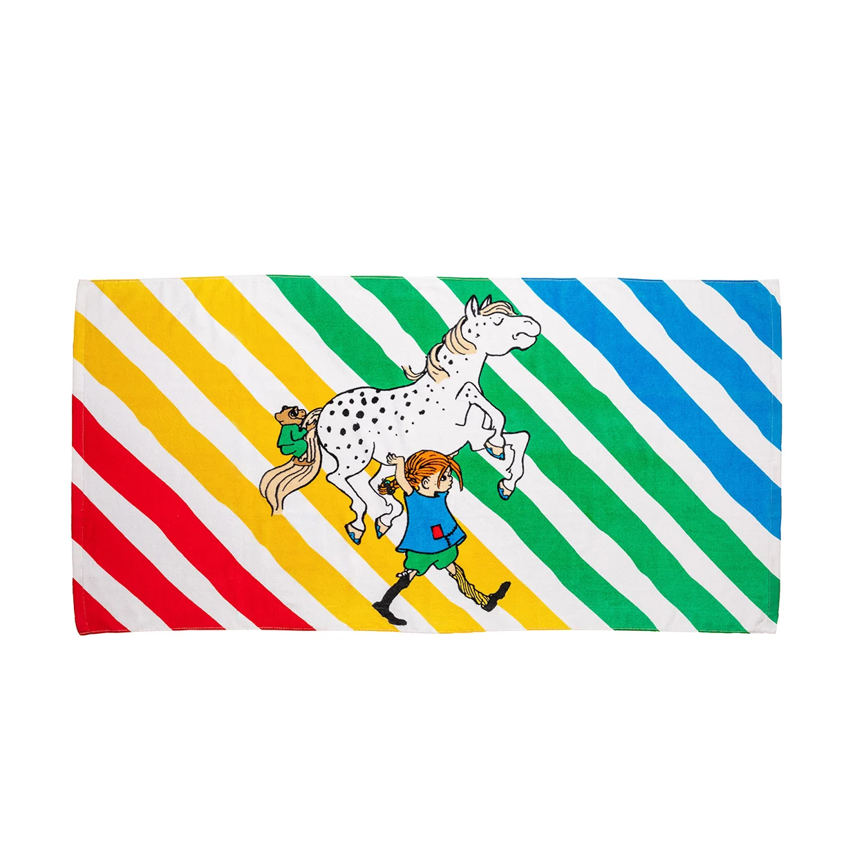 Roligt snedrandig och färgglad badhandduk 70 x 140 cm, med den starka Pippi Långstrump som bär omkring på sin prickiga häst Lilla Gubben. Materialet är mjuk bomullsvelour med hög uppsugningsförmåga. 100% bomull. Maskintvätt 40 grader. Öko-tex.