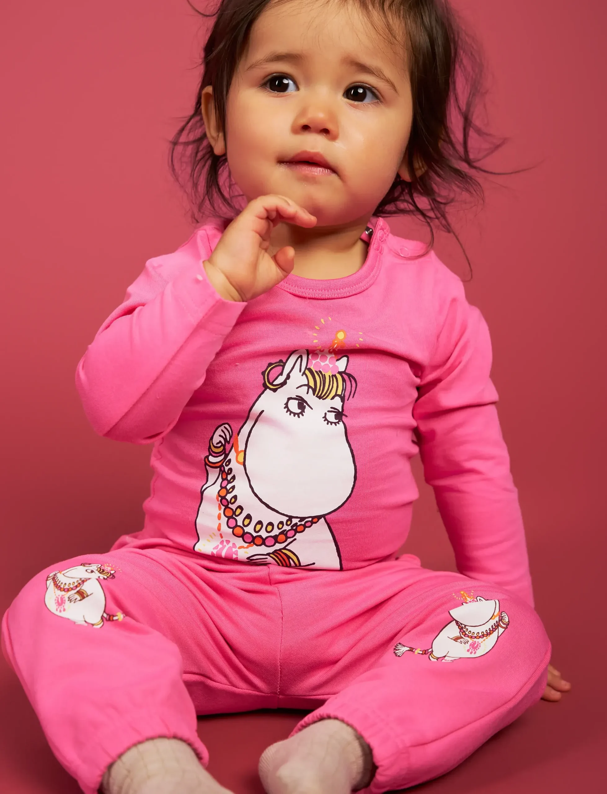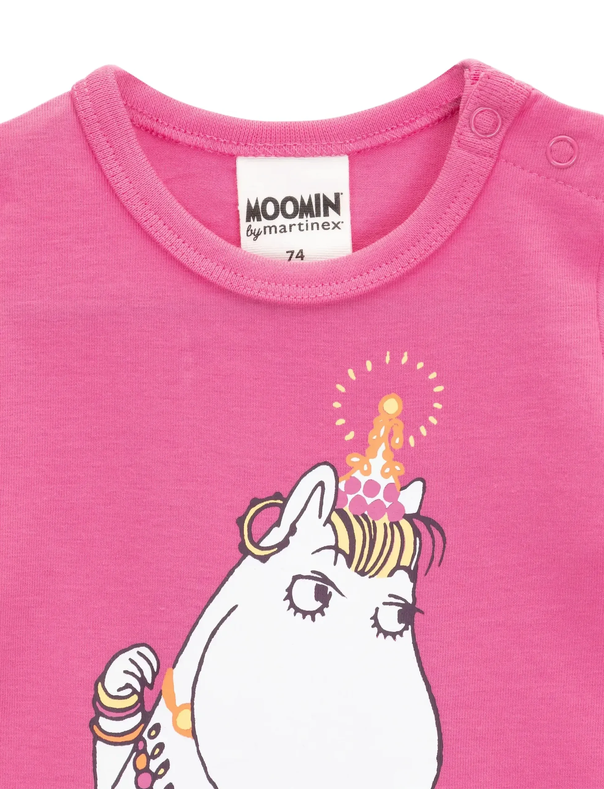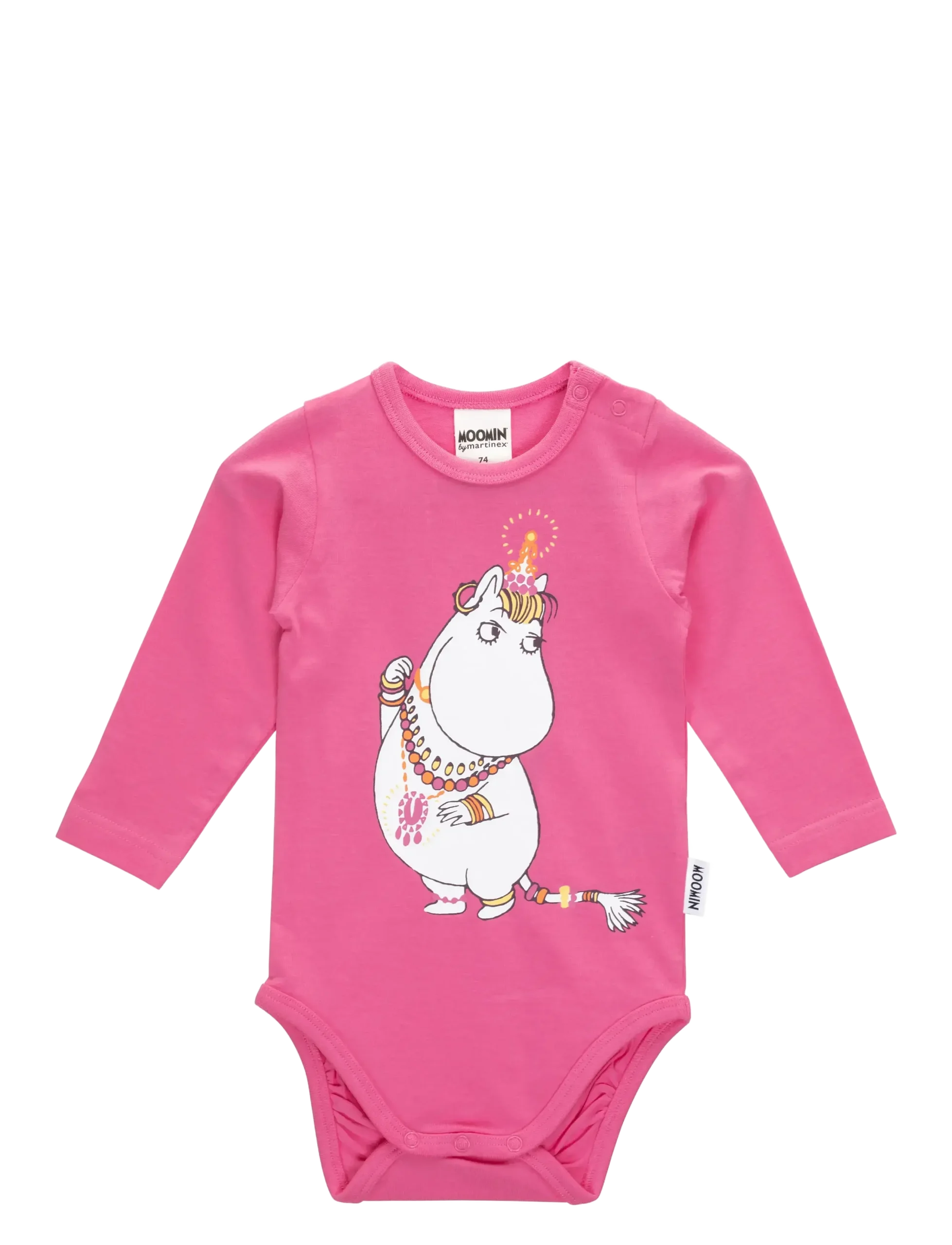 En mjuk och mysig Mumin body för baby. Med långa ärmar, tryckknappar på ena axeln och i grenen samt gott om plats för blöjan. Produkten innehåller certifierad ekologisk bomull.