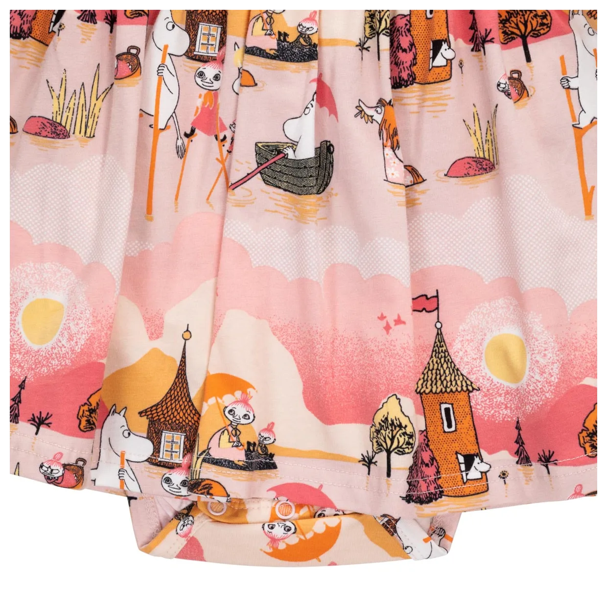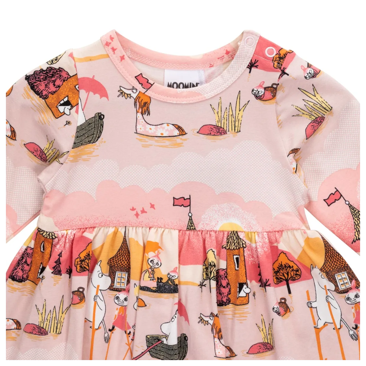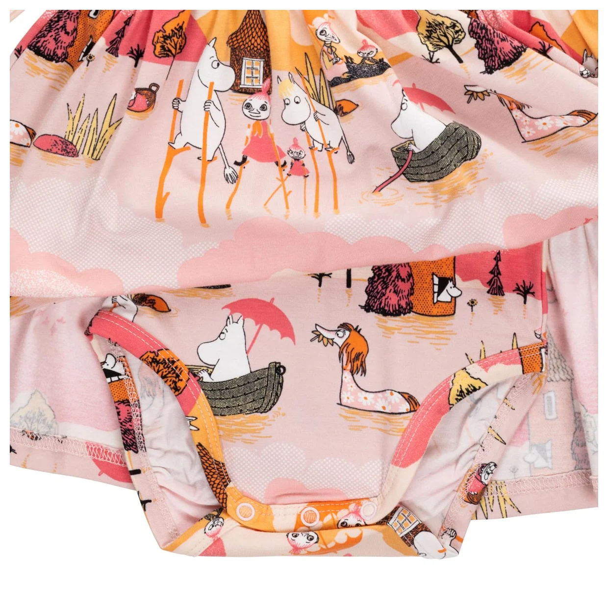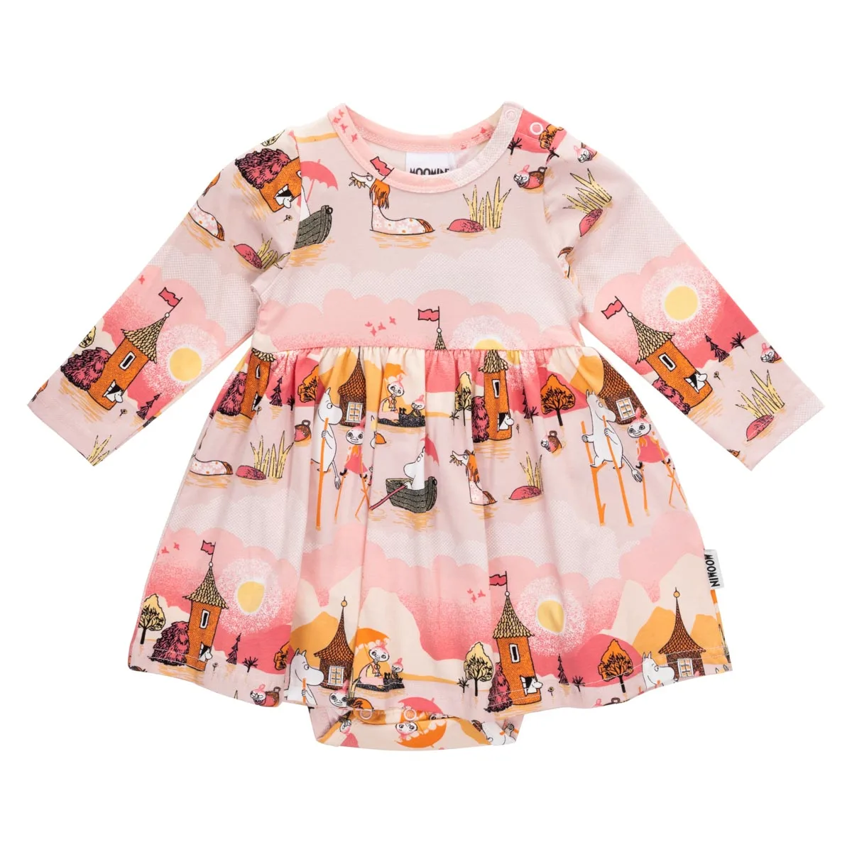 En mjuk och mysig Mumin bodyklänning för baby. Lång ärm, rund halsringning, tryckknappar på ena axeln och i grenen. Avskuren i midjan med rynk för fin och utställd kjoldel. Produkten innehåller certifierad ekologisk bomull.