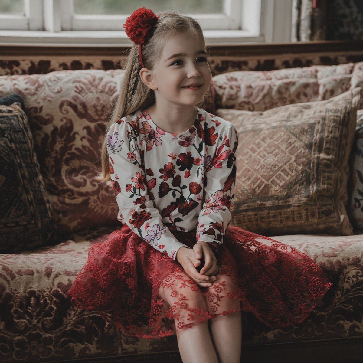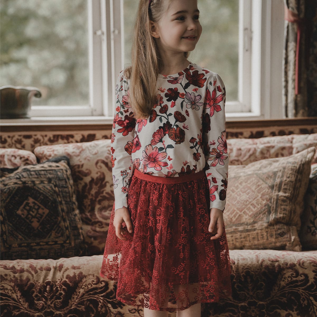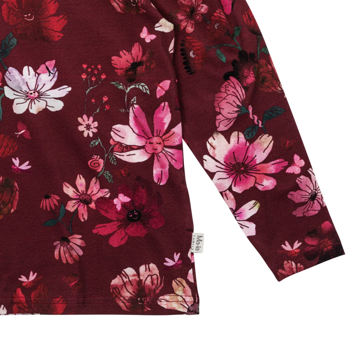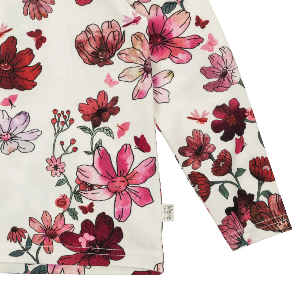 En mjuk och vacker tröja för barn, med söta små ansikten på de sagolika blommorna som vaknar till liv. Tröjan har lång ärm med lätt rynkning på axeln och rund halsringning. Produkten innehåller certifierad ekologisk bomull. Öko-tex.