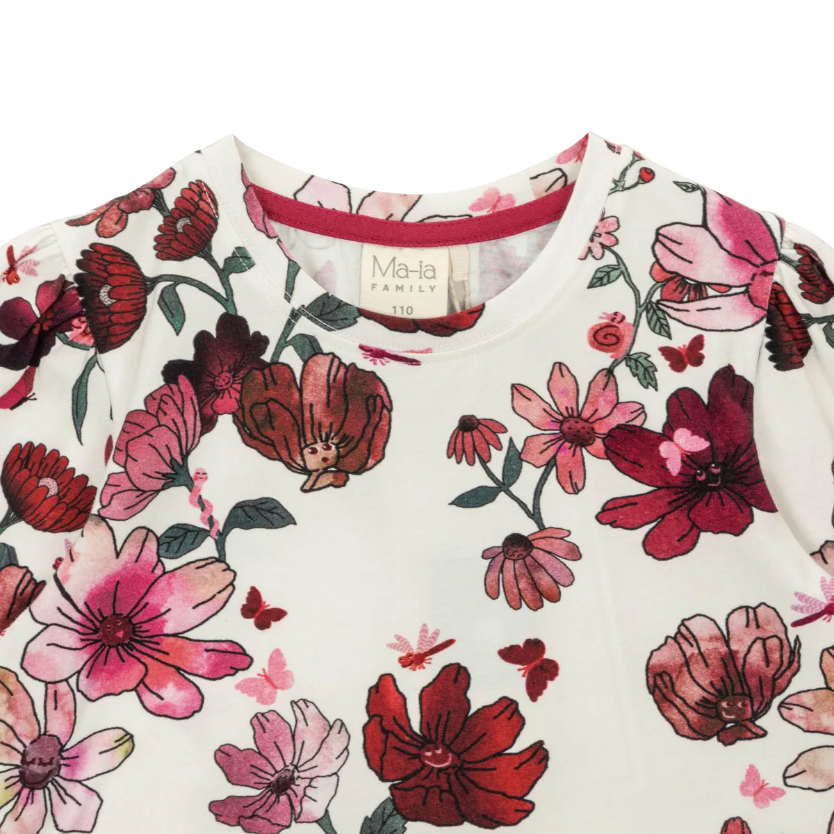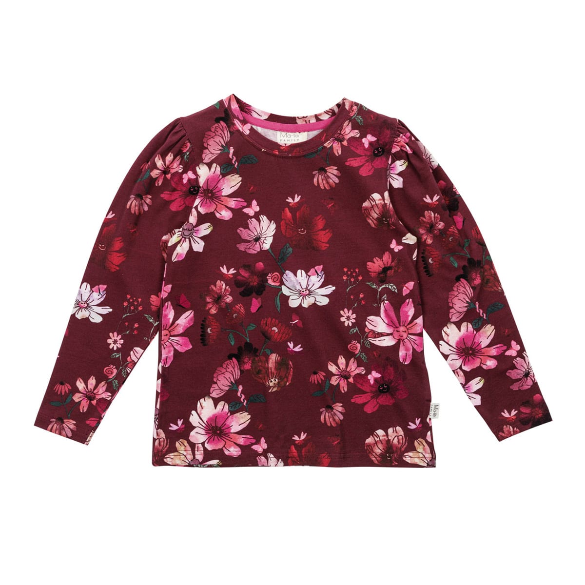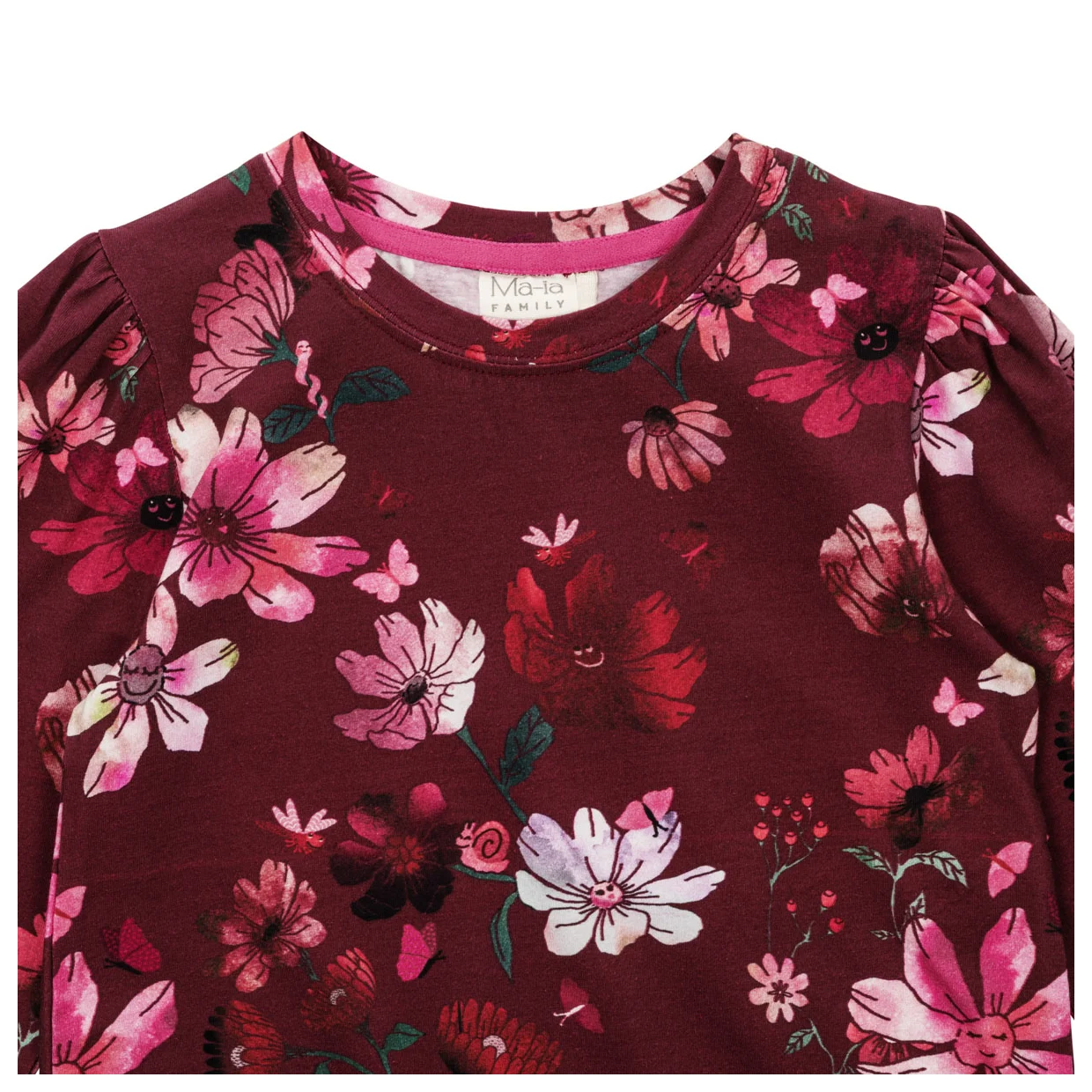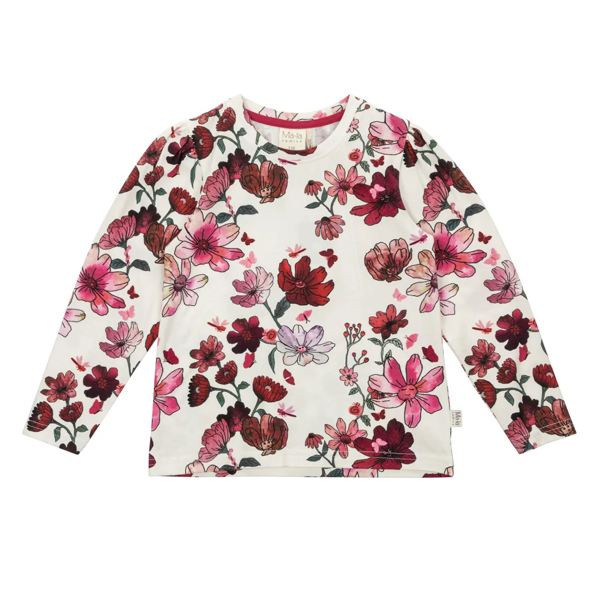 En mjuk och vacker tröja för barn, med söta små ansikten på de sagolika blommorna som vaknar till liv. Tröjan har lång ärm med lätt rynkning på axeln och rund halsringning. Produkten innehåller certifierad ekologisk bomull. Öko-tex.