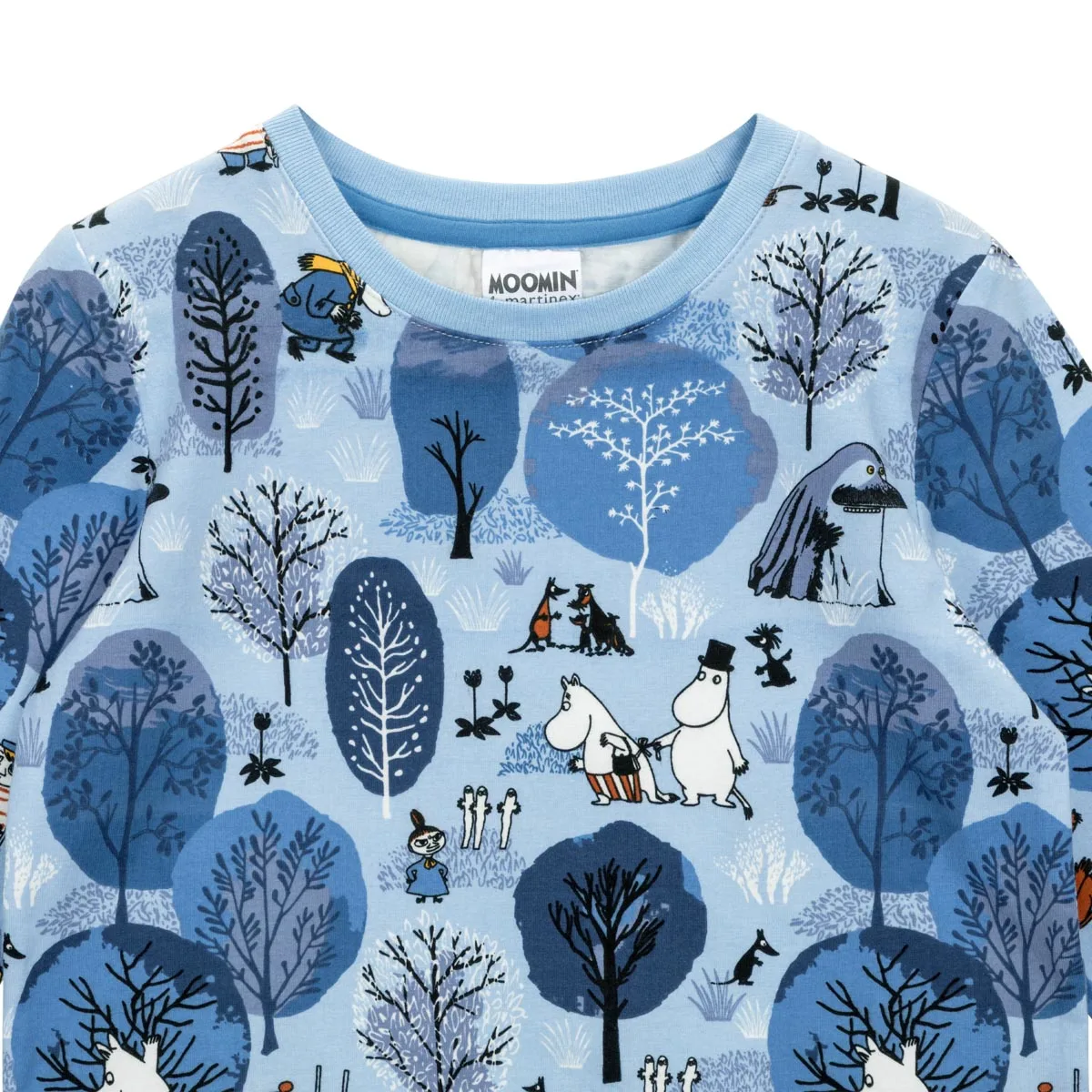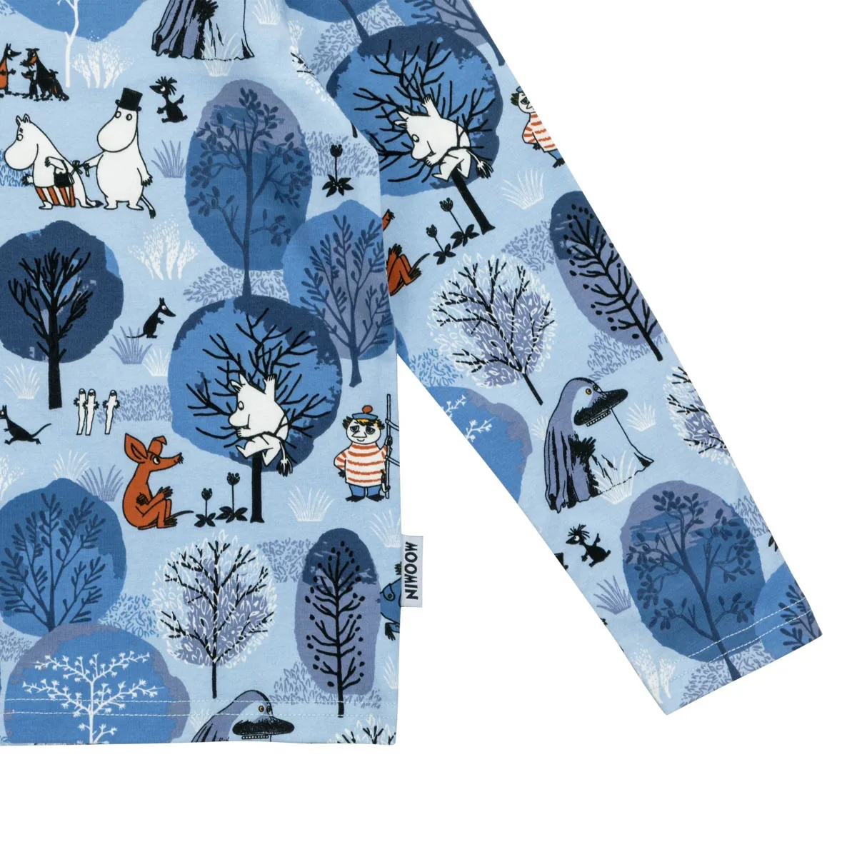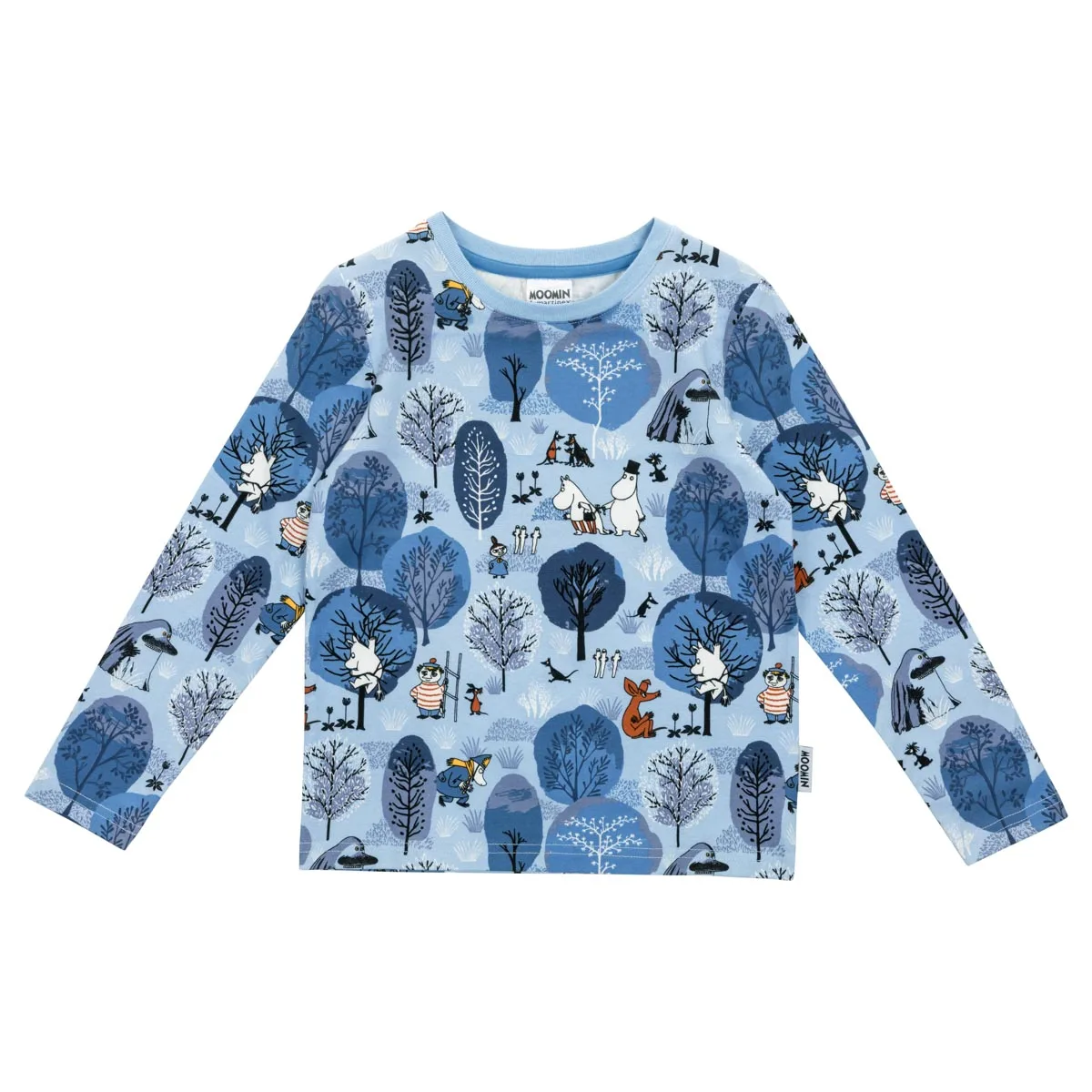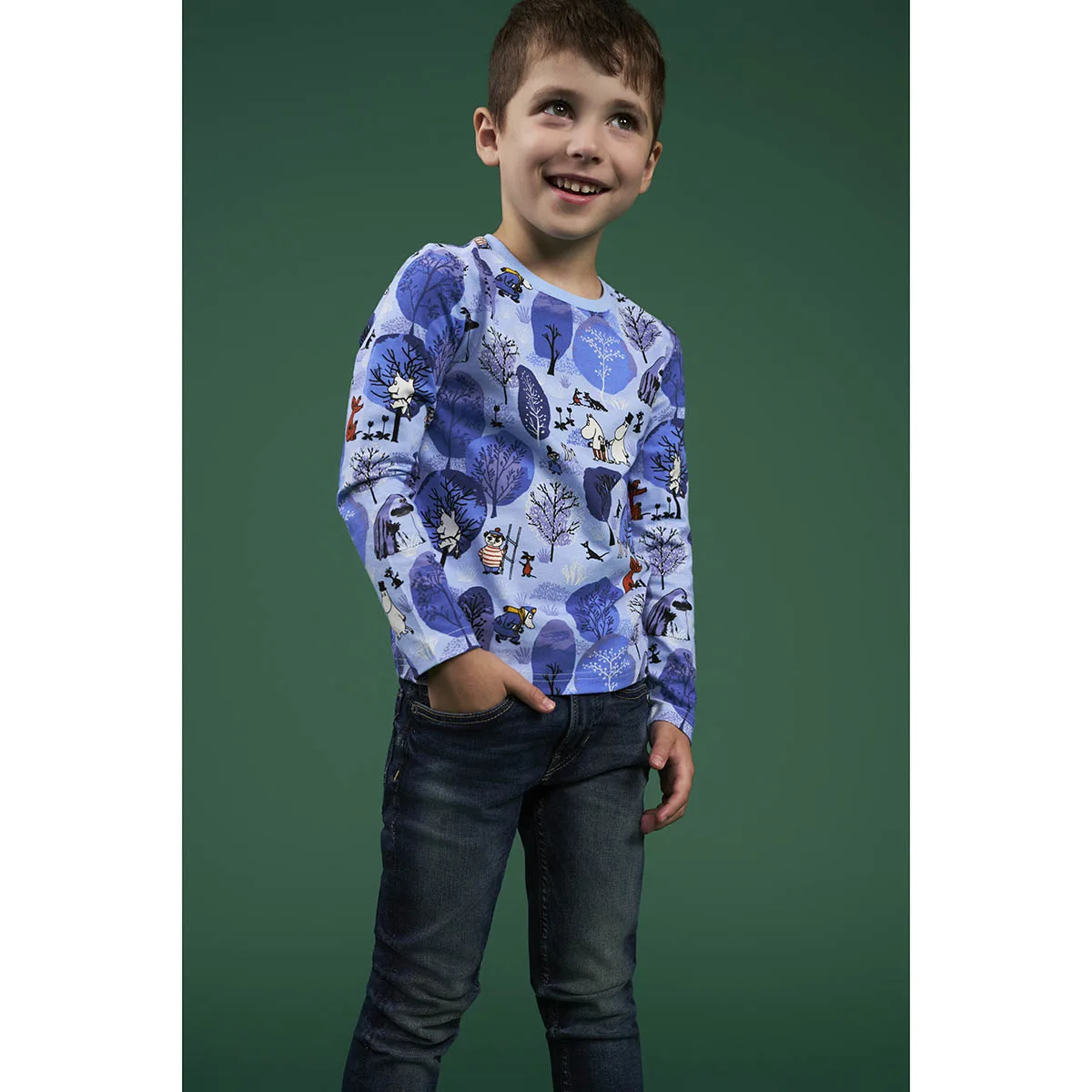 Blå barntröja med lång ärm har en rak passform. Tröjan har ett fint tryck med Muminfigurer på utsidan.