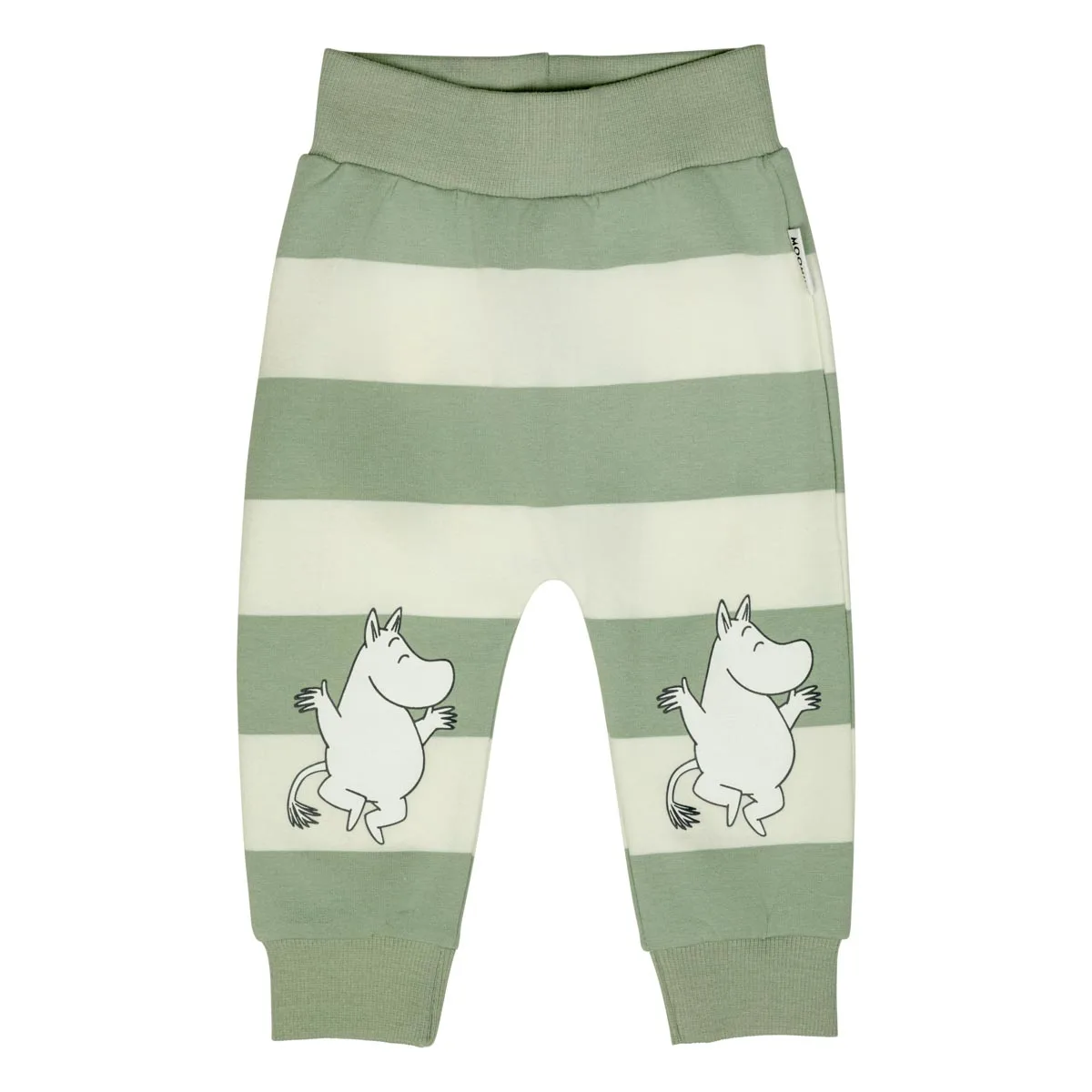 En mysig Mumin babybyxa i skön sweatshirtskvalitet med oborstad insida. Byxan har ribbad mudd i bensluten och ribbad resårmidja, samt roliga rubbertryck på ena ben och baktill. Öko-tex. Designad i Finland.