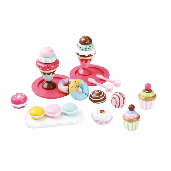 Bjud in till fika med detta färglada och bokstavligen sockersöta set för alla små blivande konditorer som älskar att baka! Frasiga munkar, rykande heta muffins och franska macarons i olika smaker är bara några av mumsigheterna som följer med i detta set. Det man kan tänkas behöva för servering medföljer – uppläggningsfat, tallrikar och skedar.